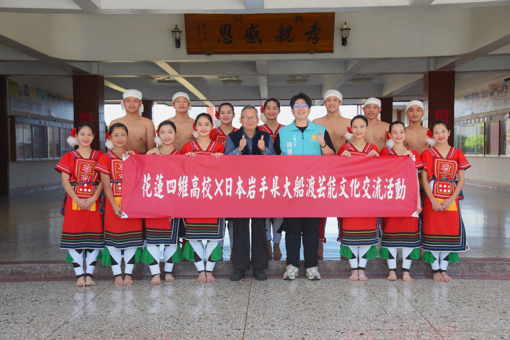 ▲花蓮市長魏嘉彥(右二)和四維高中校長蔡忠和(右一)分別鼓勵原舞社同學,透過舞蹈成為文化交流的橋梁。