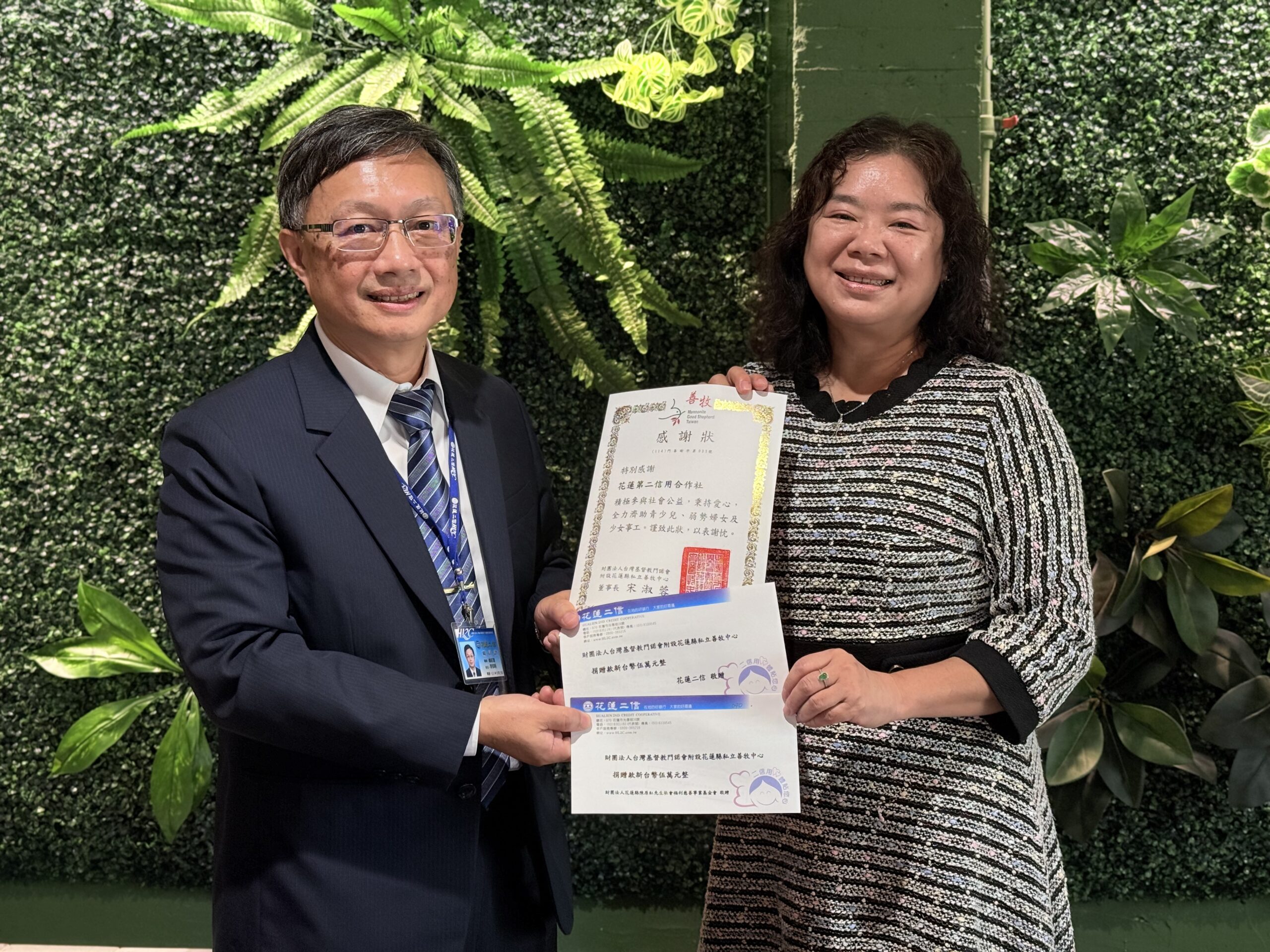花蓮第二信用合作社與財團法人花蓮陳原紅先生社會福利慈善事業基金會,長期關懷在地社福,今(10)日上午花蓮二信總經理李郅明由美崙分社經理蔡忠琪陪同,捐贈基督教門諾會花蓮善牧中心10萬元,支持中心在少女與受暴婦女保護、兒少陪伴與婦女就業培力等多項服務,由善牧中心執行長朱玉貴代表接受。