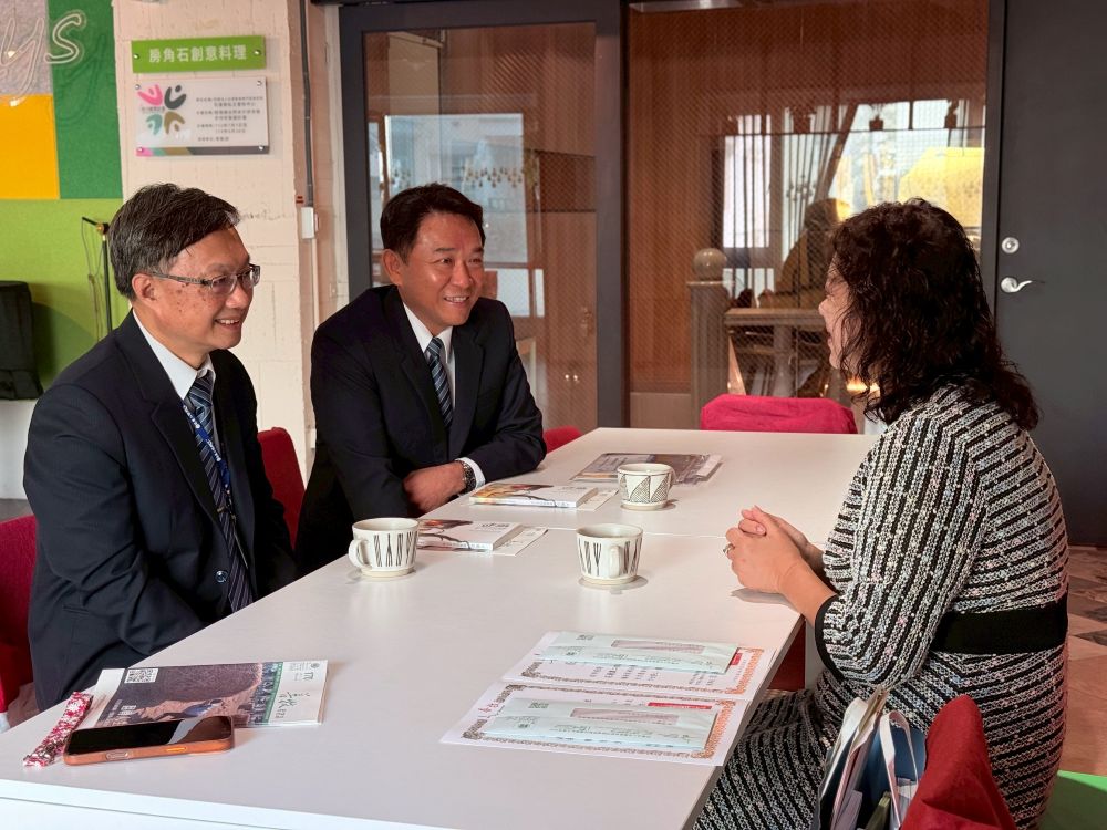 ▲花蓮善牧中心執行長朱玉貴(右)向花蓮二信總經理李郅明(左一)、美崙分社經理蔡忠琪(左二)分享善牧服務亮點。