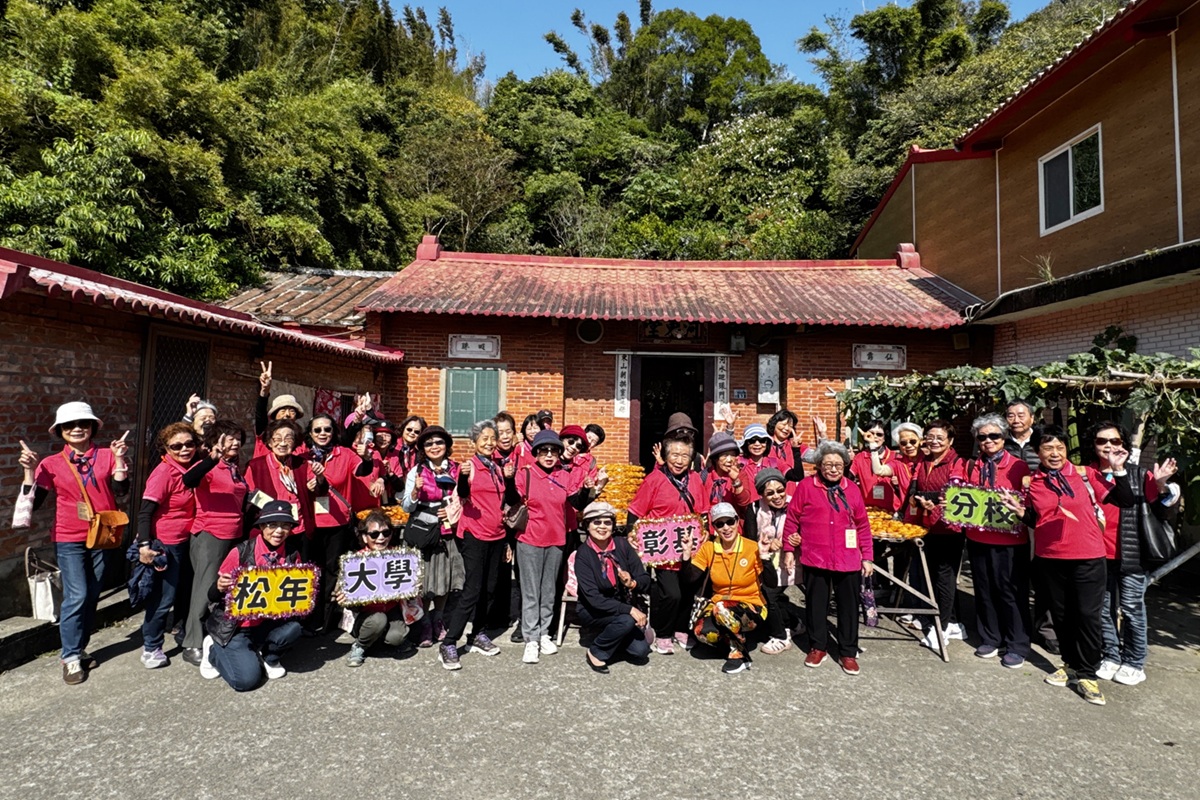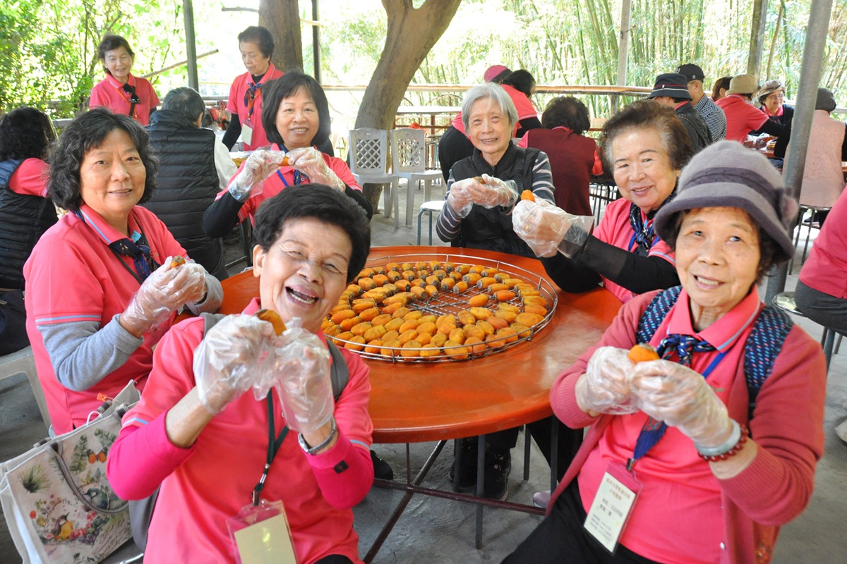 此次特別安排帶領學員至松年大學總校新竹聖經學院參觀,總校校長阮介民牧師、副校長及幹事熱情款待大家,學員們徜徉在優美的綠蔭草地微曬溫暖陽光及拍照,留下與聖經學院的美好紀錄。接續前往柿餅教育農場,體驗捏柿餅文化,每年九月至翌年一月在農園映入眼簾的盡是一幅幅詩情畫意的美景,黃橙橙的柿子置滿於棚架上,一顆顆金色小球正享受著日光浴,導覽員講解透過新竹特有的九降風與日曬,並融合傳統晒柿工藝,經陽光、風吹7~9天,以及烘烤、手工輕撫愛的按捏後,這些黃金般的小圓果實才會變化成金紅色的美味柿餅。這過程不僅創造了美食,更是一種生活態度,又如同松年大學的銀髮學員寶貴的人生經歷,愈沉愈香。