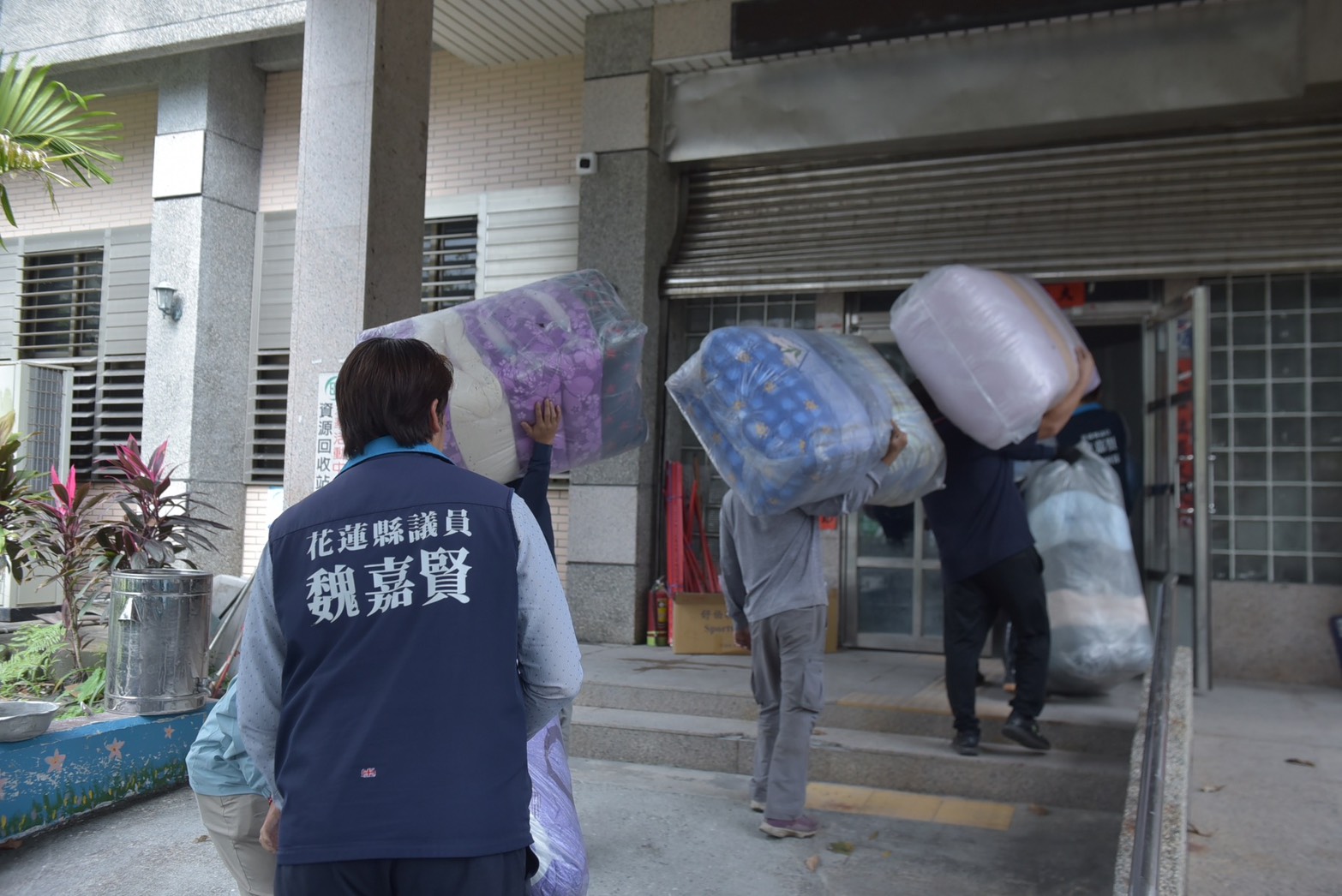 由於捐贈物資數量龐大,花蓮市公所清潔隊主動協助物資存放、整理及載運作業,並由魏嘉賢偕同市公所祕書蘇浩然、清潔隊同仁南下光復鄉,將愛心 棉被等寢具分送各村落,期盼把社會關懷第一時間送到需要的對象手中。