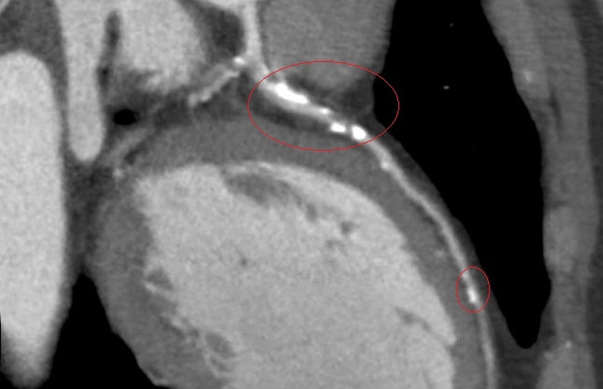 李學林表示,林先生日前接受肺癌篩檢時意外發現心血管鈣化,但無法確認是血管內或血管外鈣化。因患者平時已出現胸悶症狀,進一步做心臟冠狀動脈電腦斷層,確認為3條主要冠狀動脈血管內鈣化狹窄達85%以上,若未及時處理,隨時可能引發急性心肌梗塞。