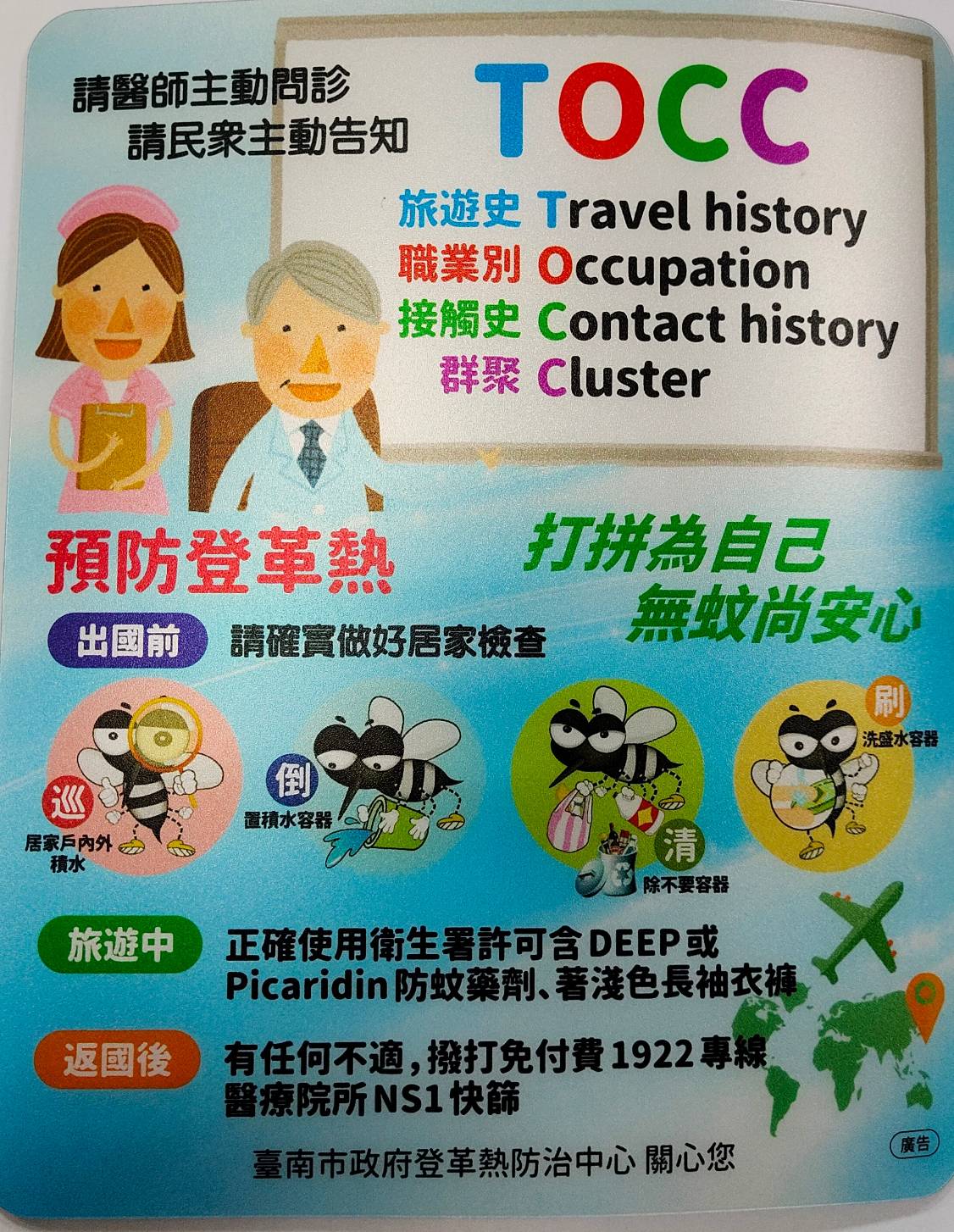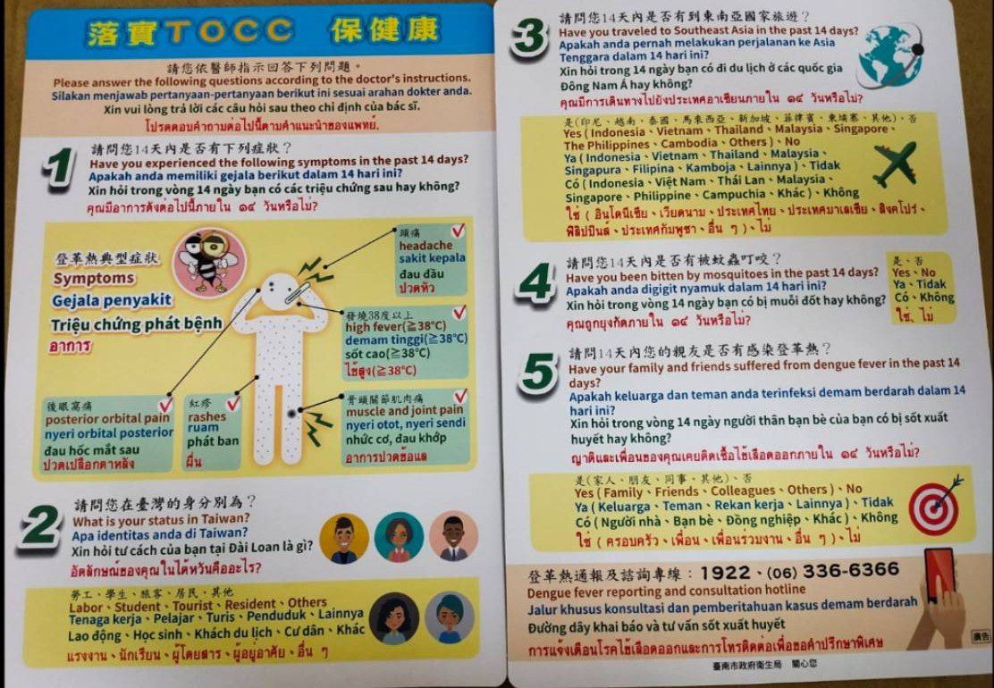 登革熱防治中心吳昭慧副執行秘書籲請民眾及醫療機構,加強就醫、即時快篩和通報警覺性,應主動詢問並落實T.O.C.C.(旅遊史、職業別、接觸史、群聚情形)告知及問診,若民眾就診時有流行區旅遊史,出現發燒並伴隨以下任兩項症狀(如皮疹、噁心、嘔吐、頭痛、眼窩後疼痛、肌肉痛、關節痛或骨頭痛)時,請即刻使用登革熱NS1快篩試劑檢測,並於24小時內依《傳染病防治法》第39條規定完成通報。