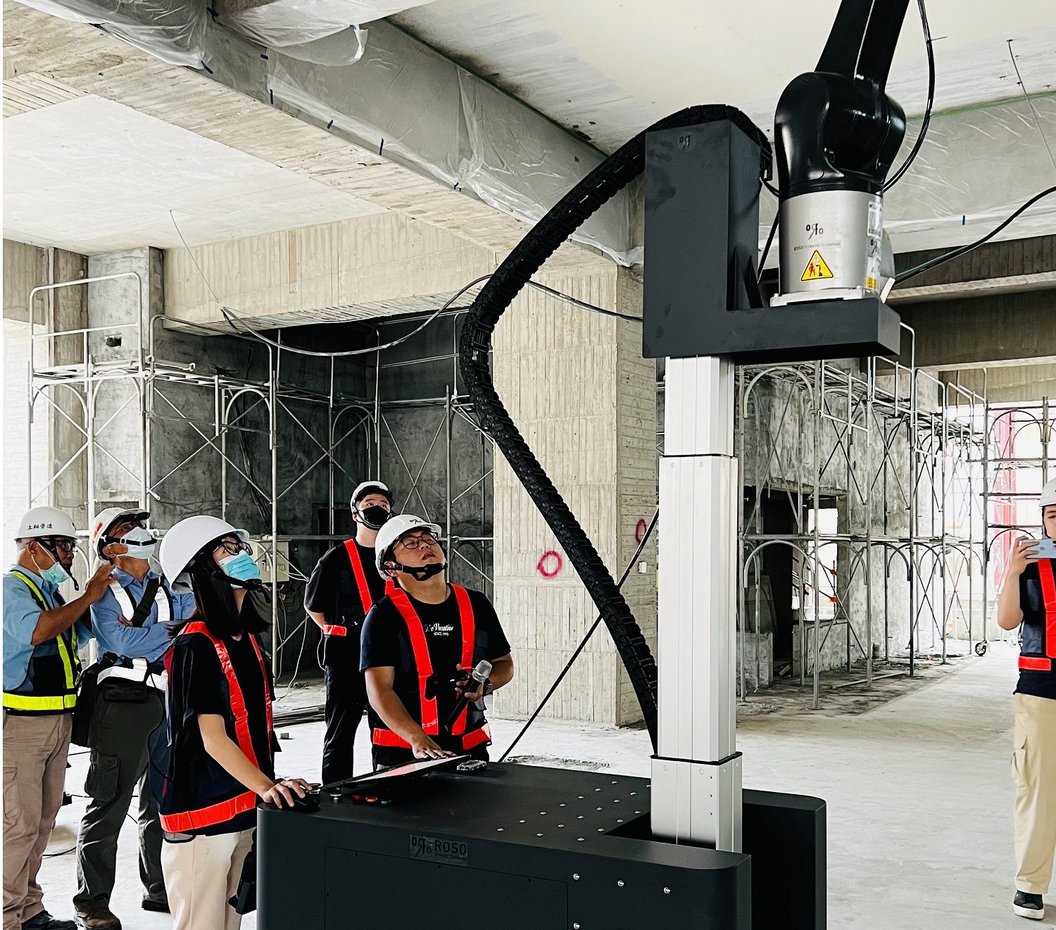 目前,趙建銘建築師事務所亦攜手華碩集團亞旭電腦、逢甲大學建築學院 RossCoop 實驗室,於多項公共工程中導入機械手臂施工技術,包括由上鋌營造承造的「高雄高工立體停車場」、「山明水秀社會住宅」,以及春原營造負責的「海洋委員會合署辦公室」。其中,機械手臂天花板噴漆系統無需搭設施工架,不僅降低高空作業風險,也將噴漆等高危險、不健康的工序交由機器執行,進一步保障勞工安全,展現科技介入營建現場的實際效益。