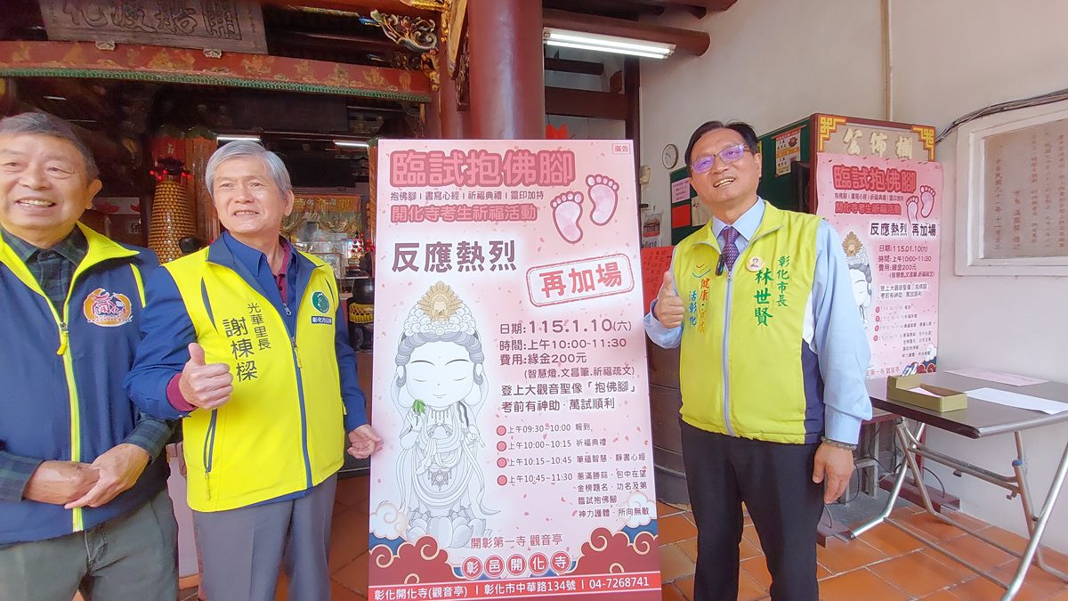 鑑於國內各項重要考試又將接踵而來,彰化市已有300多年歷史的開化寺,為了替考生祈福,將於明年1月10日舉辦別開生面的《臨試抱佛腳》活動,內容包括:祈福團拜、心經書寫、靈印加持等,藉由觀世音菩薩與文昌帝君加持穩定考生身心,且將開放寺內位於樓頂的一尊8公尺高大觀音聖像,讓考生登上樓頂,與觀音像合影並「抱佛腳」,期盼藉由「神助」,一舉金榜題名!