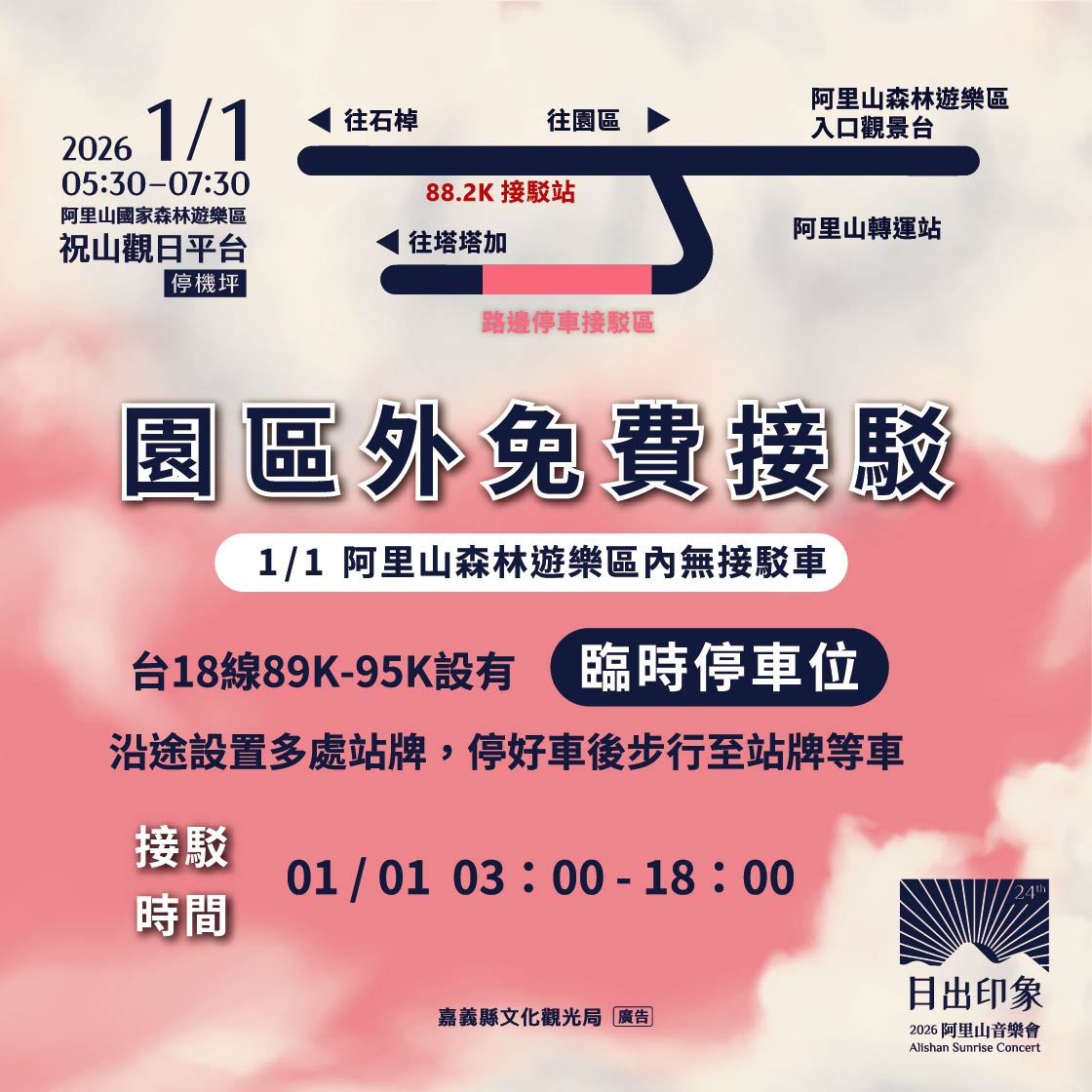 嘉義縣元旦指標活動「2026阿里山日出印象音樂會」將於明年元旦清晨登場,今年以「雲上之夢」為主題,規劃於阿里山高山場域舉行。翁章梁說,音樂會結合爵士、搖滾與古典音樂三大元素,透過音樂陪伴民眾迎接新年第一道曙光,呈現阿里山獨有的自然景觀與藝術氛圍。