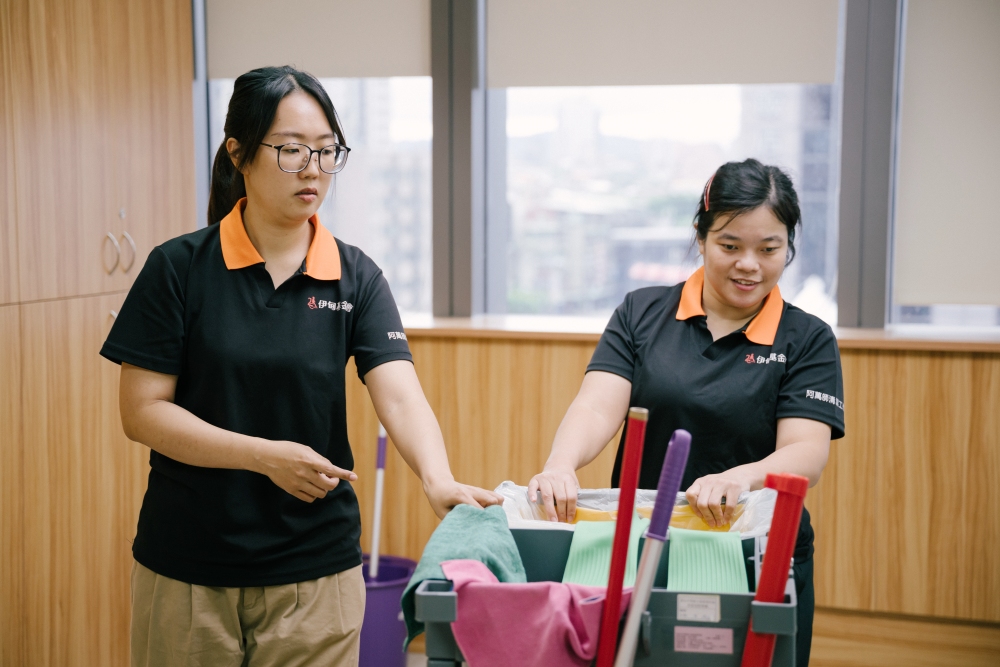 ▲蔡依靜主任親自示範清潔流程,陪伴庇護員工在實作中累積技能與信心。(圖/庇護工場提供)