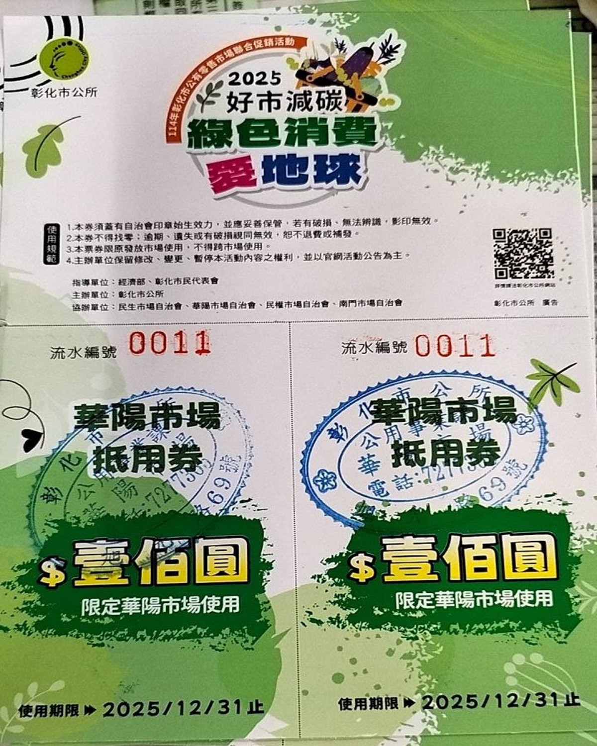 為促進彰化市的市場經濟活絡,彰化市公所將於12月19、20日與12月26、27日,連續兩個星期五、六,在民生市場、華陽市場、民權市場與南門市場等4處公有市場,舉辦「彰化市114年市場聯合促銷活動」,活動配合經濟部【好事減碳 綠色消費愛地球】新理念,並延續「2025傳市品牌-眾星雲集 好市加倍劵」為行銷主題,共準備了2,400張加倍券,民眾憑100元現金即可兌換到每張價值200元的加倍券,加倍好康!