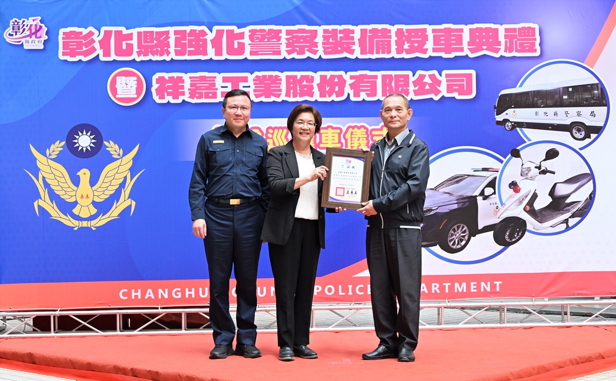 為強化縣內警用裝備,提升彰化縣的治安與交通,彰化縣警察局於今(17)日在縣警局中庭舉辦「強化警察裝備授車典禮暨祥嘉工業股份有限公司捐贈巡邏車儀式」,由縣長王惠美主持,議長謝典霖、議員及各協勤民力與會。本次活動不僅見證縣府對警政工作的大力支持,祥嘉工業慷慨捐贈一輛價值新臺幣 120 萬元的全新巡邏車,共同為提升彰化縣的治安與交通而努力。感謝議長謝典霖及所有議員對縣政預算的支持,讓警察同仁能更順利推展治安維護工作。