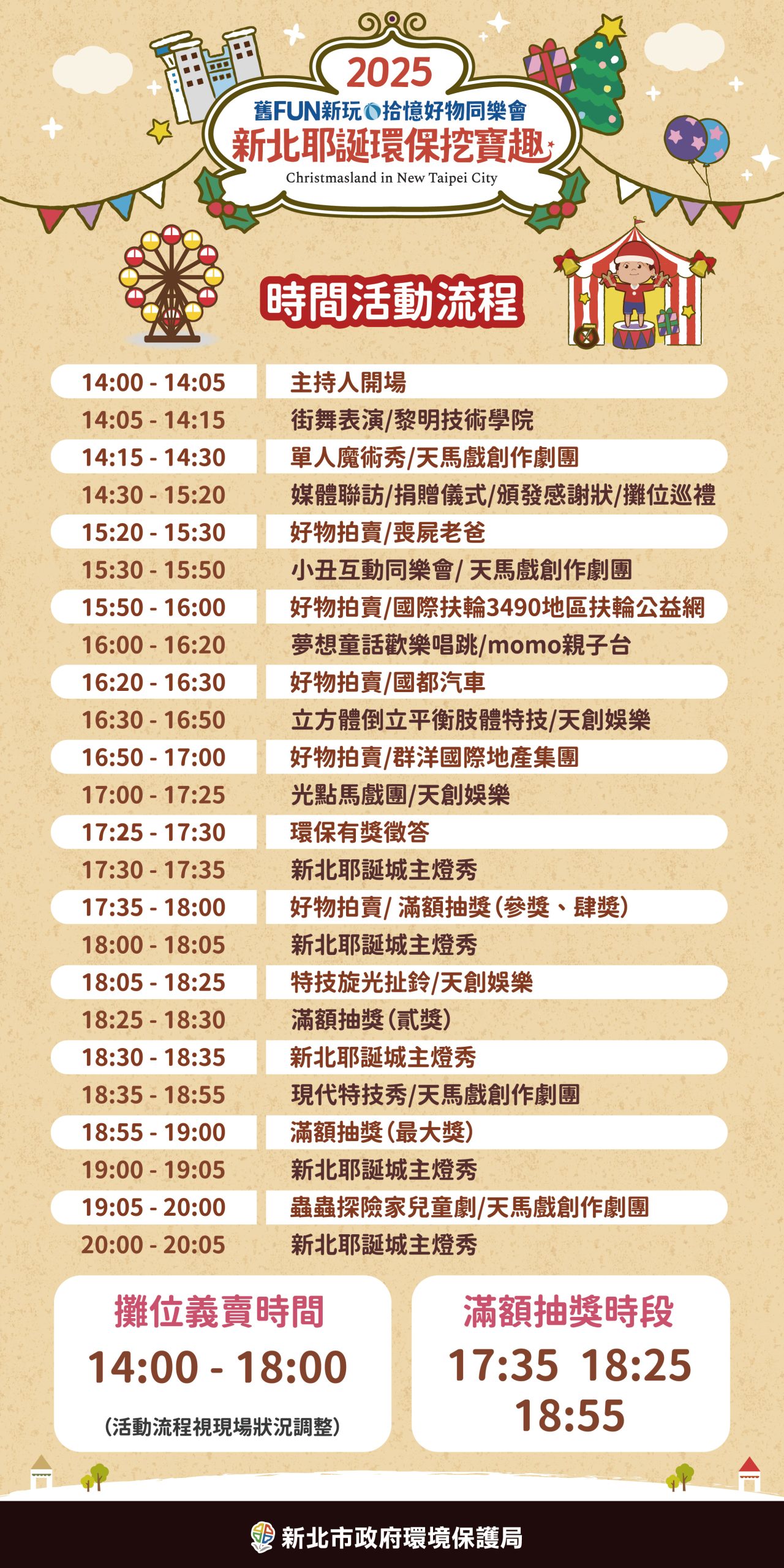 環保局表示,今年「新北耶誕環保挖寶趣」已邁入第11年,活動主題「舊FUN新玩‧拾憶好物」,意寓著每一個承載著獨特回憶與故事的二手好物,透過義賣找到新主人,展開循環再利用的旅程。當日義賣所得也將全數納入新北市好日子愛心大平台,讓這些物品轉化成愛心,幫助需要幫助的人。