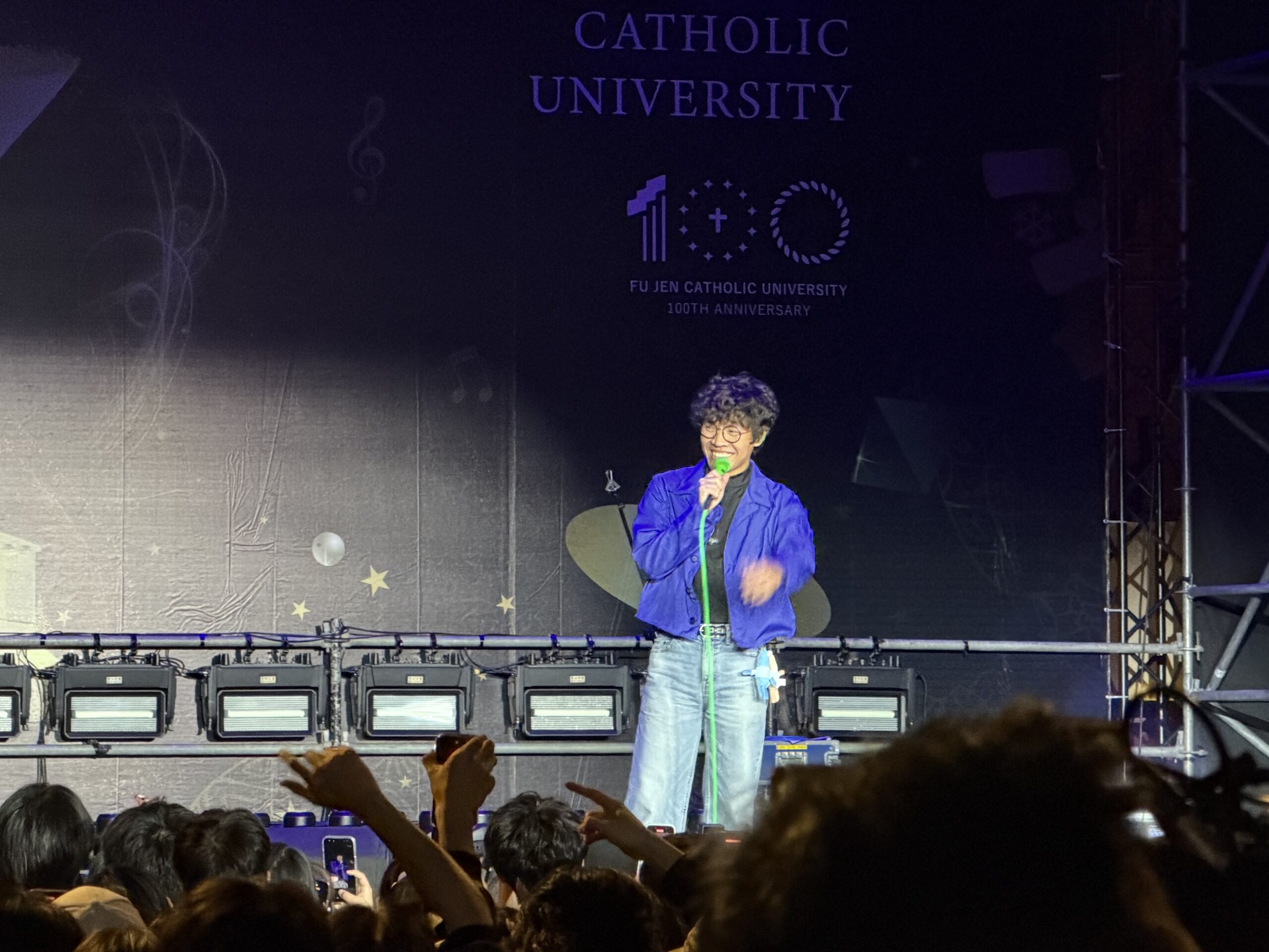 ▲盧廣仲是第二次來輔人潮,他以獨特的盧氏風格與大家互動,不只一起合唱也會開玩笑逗樂大家。(圖/輔大提供)