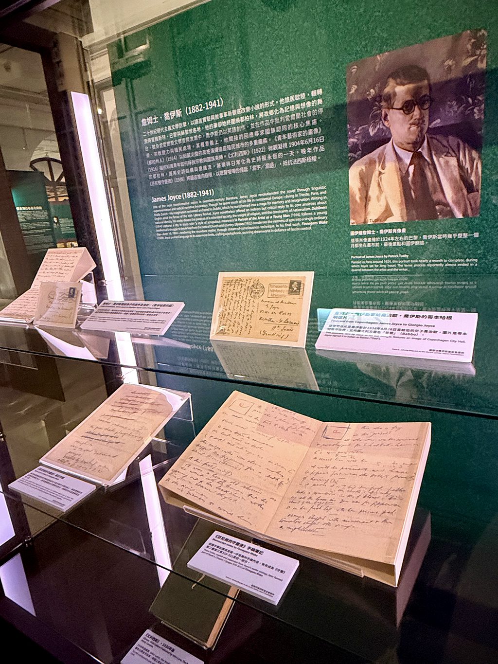 ▲借自「蘇黎世喬伊斯基金會」的珍貴文物首度來臺亮相:喬伊斯《芬尼根的守靈夜》創作筆記、寫給兒子的明信片、寫給孫子的信件〈哥本哈根的貓〉以及英國第一版《尤利西斯》。