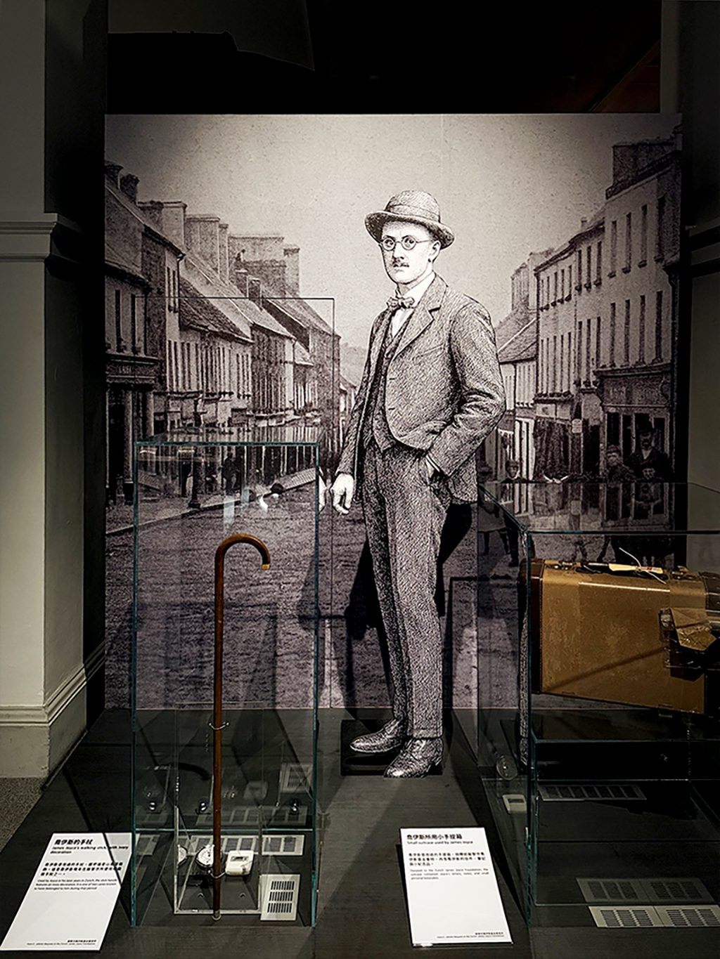 ▲作家喬伊斯(James Joyce)使用的拐杖與手提箱首度來臺亮相。文物借自「蘇黎世喬伊斯基金會」作家喬伊斯(James Joyce)使用的拐杖與手提箱首度來臺亮相,文物借自「蘇黎世喬伊斯基金會」。還有多項珍貴文物來自瑞士、愛爾蘭與美國紐約公共圖書館,為相關文物首次在臺灣展出,意義非凡。