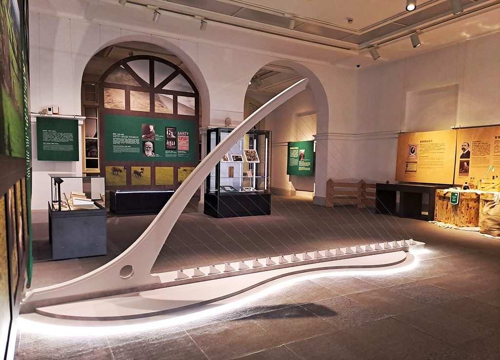 ▲「愛‧愛爾蘭─島至島的文學之愛」特展入口意象以都柏林之貝克橋破題,以豎琴意象作為設計。