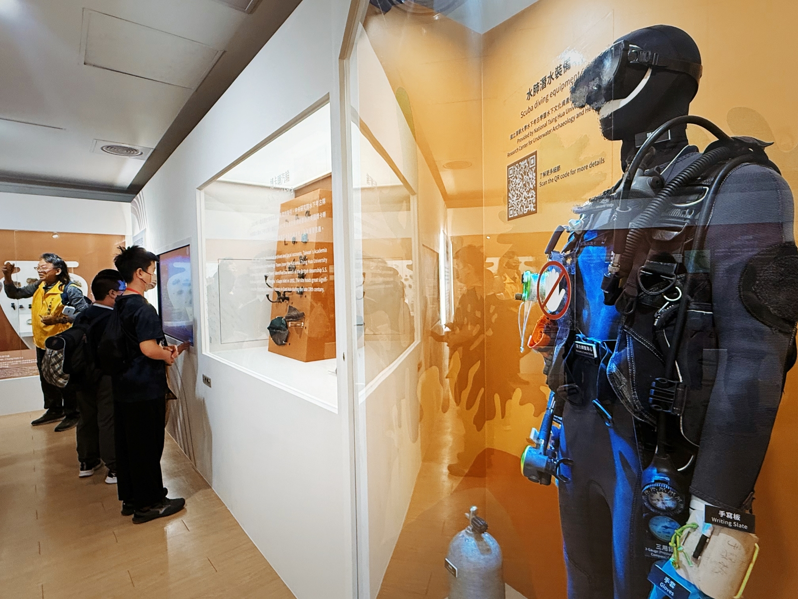 本次展覽充分展現產官學「強強聯手」的跨域成果。展場亮點首推由清大慨允出借、難得一見的完整「安平壺」出水真品,以及第一線水下考古員的專業水肺潛水裝備,讓民眾近距離感受水下作業的艱鉅與專業。有別於傳統靜態展示,館方更精心邀請清大考古隊員親聲錄製語音導覽,將冰冷的研究數據轉化為充滿溫度的探險故事。觀眾掃描QR Code即可聆聽,甚至透過YouTube分享,彷彿親身與考古學家並肩潛入幽暗深海,探索未知的歷史拼圖。而在視覺體驗上,則由中國科技大學團隊助攻,以沉船遺址為背景並參考古代海洋生態資料,運用無接縫投影技術打造長達15米的「沈浸式海底隧道」,重現沉船遺址周邊的魚群動態與光影變化,虛實交錯的身歷其境感,勢必成為年底最吸睛的打卡熱點。