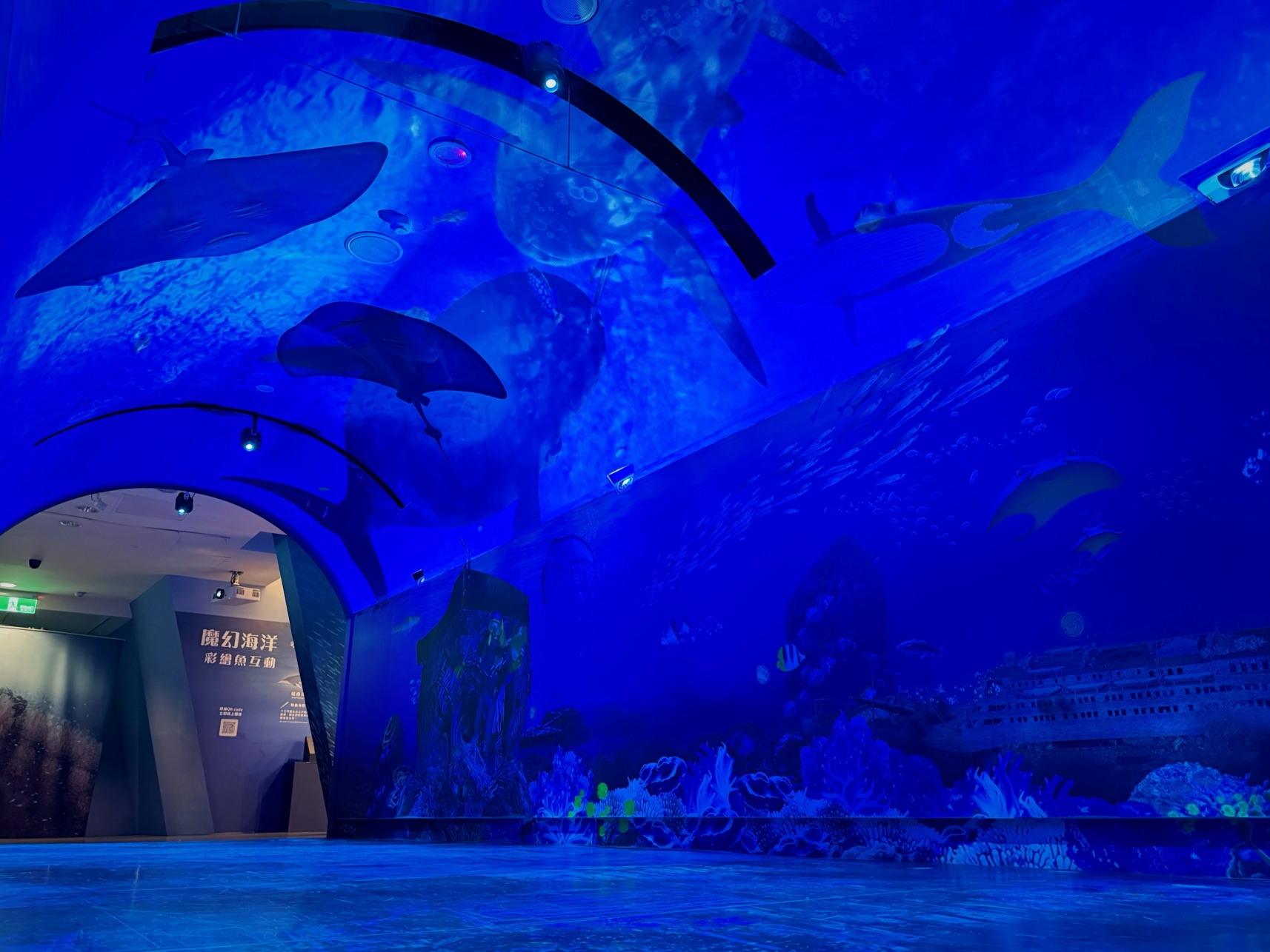 ▲長達15米的「沈浸式海底隧道」運用無接縫投影技術重現沉船遺址魚群動態。(圖/新北市立十三行博物館 提供)
