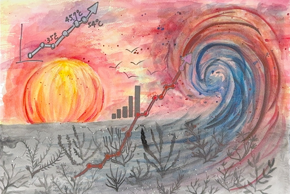 此外, 在NODASS圖文創作項目中,學生們結合生活經驗與NODASS資料庫創造藝文與海洋科學有趣的連結。其中高中組內湖中學畫作的意涵,熱浪造成的火紅場景,天空如火一般熾熱,白化的珊瑚在海底遭到破壞,黑暗的海面宛如被災害消耗殆盡,用黑灰色的海洋與珊瑚,象徵已遭到破壞的海洋生態;用橘紅色的海浪,象徵「熱浪」在燒灼海洋;用不斷竄升的折線圖,代表自然破壞下溫度的上升;用長條圖意味著熱浪來襲時溫度上升的快速。