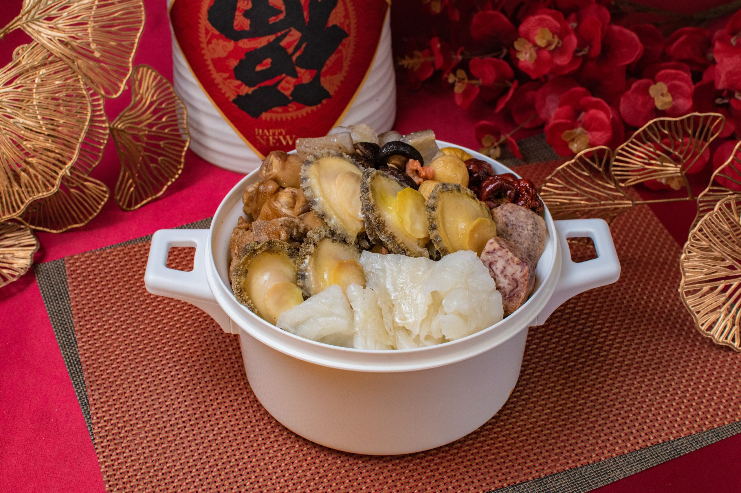 年菜外帶套組內容豐富澎湃,主廚以年節吉祥寓意為靈感精心設計,包含集結三樣前菜的「福祿壽歡喜拼盤」,寓意滿滿的開運前菜,以蒜苗烏魚子、醉翁雞腿、和風日月貝,三味開啟佳節序幕,迎來新年好兆頭;以鮑魚、上湯慢火燉煮的「鮮鮑花膠佛跳牆」,湯頭濃郁醇厚、料足香厚,象徵圓滿豐收;肉質細緻鮮甜的「古法油醋貴妃魚」嚴選鮮嫩鱸魚,以秘製油醋淋香,寓意年年有餘;「椒鹽蒜香豚仔骨」金黃香酥的豚仔骨裹上 蒜酥與七味粉,鹹香夠勁深受大人小孩喜愛;最後搭配香氣十足的「海皇明蝦薑黃飯」,鮮甜草蝦佐薑黃飯與濃郁海皇醬,讓人回味無窮。