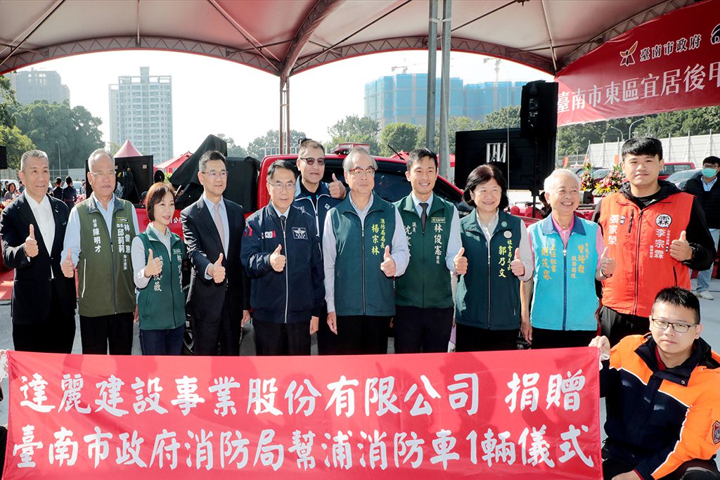 今日達麗建設除透過都市更新回饋社會住宅外,也於動土典禮現場同步舉行捐贈儀式,捐贈台南市政府消防局1輛幫浦消防車,由達麗建設董事長謝志長代表捐贈,市長黃偉哲代表受贈並回贈感謝狀,展現企業深耕地方、回饋社會的具體行動。