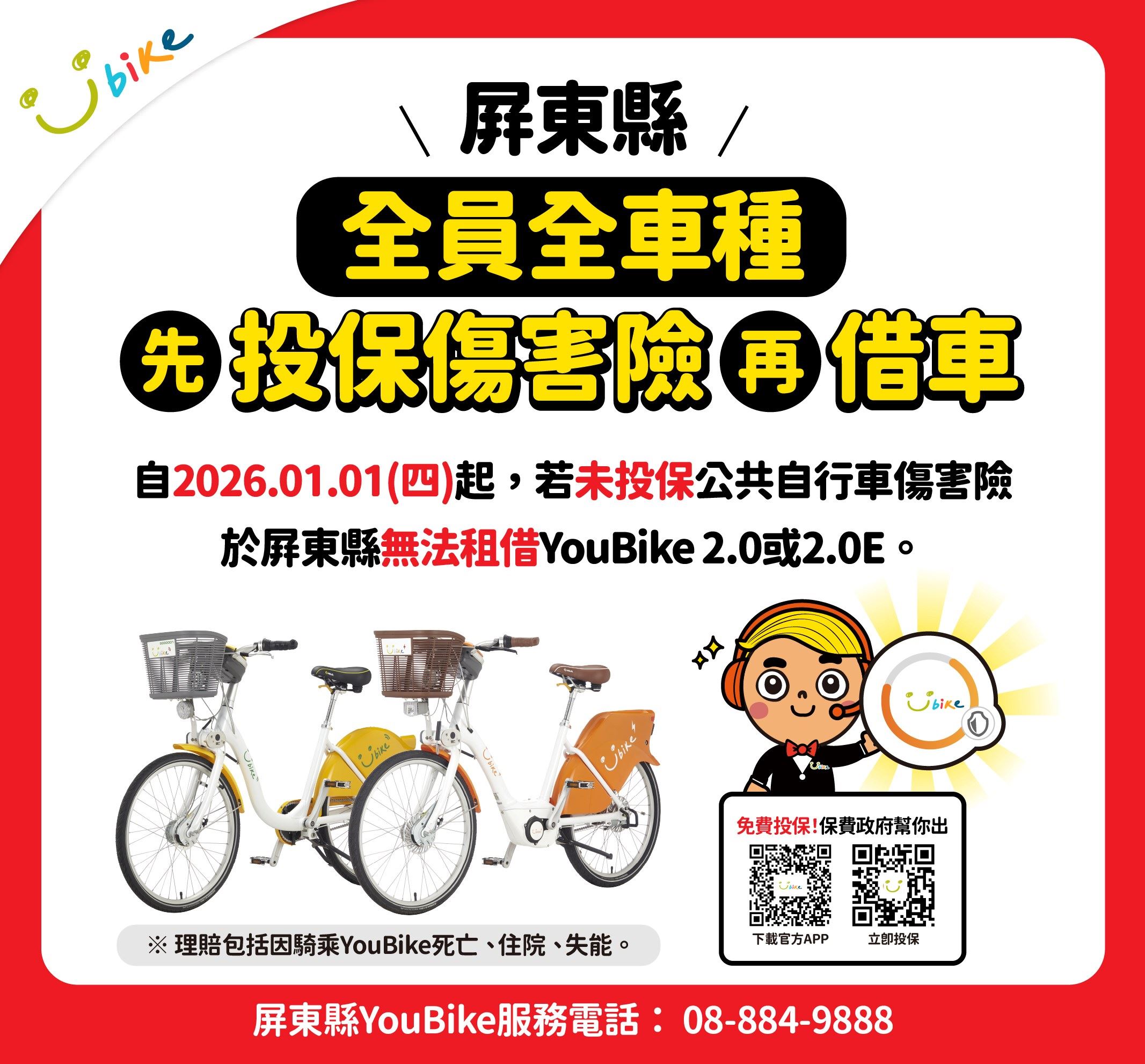 【記者范家豪/屏東報導】 屏東YouBike啟用至今,騎乘人次累積超過400萬人次,屏東縣政府為持續提升公共自行車使用者騎乘保障與安全,自115年1月1日起,全面實施YouBike全車種YouBike2.0及YouBike2.0E,皆須投保「公共自行車傷害險」才可租借,未投保者將無法在屏東縣租借YouBike。