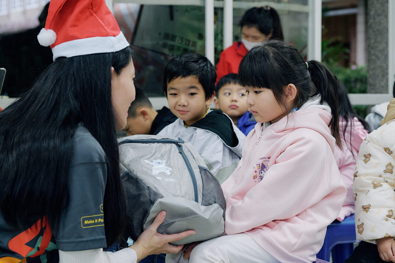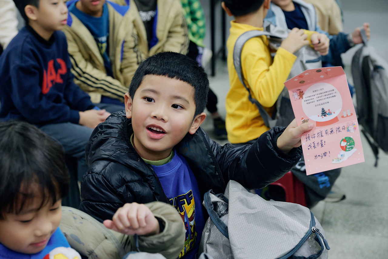 志工們在上班日暫時放下手中的公務,戴上耶誕節頭飾化身忙碌的耶誕小精靈,以流水線形式協力分工,將禮物逐一放入為孩子們準備的後背包中。另一頭負責寫卡片的志工們,原本在電腦上打字、處理公務的雙手,拿起筆一字一句寫下對學童的祝福與鼓勵,卡片內容或許簡單,卻飽含對孩子們的祝福。為了讓學童們感受到被重視的真實感,志工們更化身「耶誕老人」組成送禮隊伍,前往新北市金山區三和國小及萬里區大鵬國小。當學童們打開禮物、看到親筆卡片時,臉上綻放的驚喜與開心笑容,在飄著雨的冬日,溫暖了每位志工的內心。