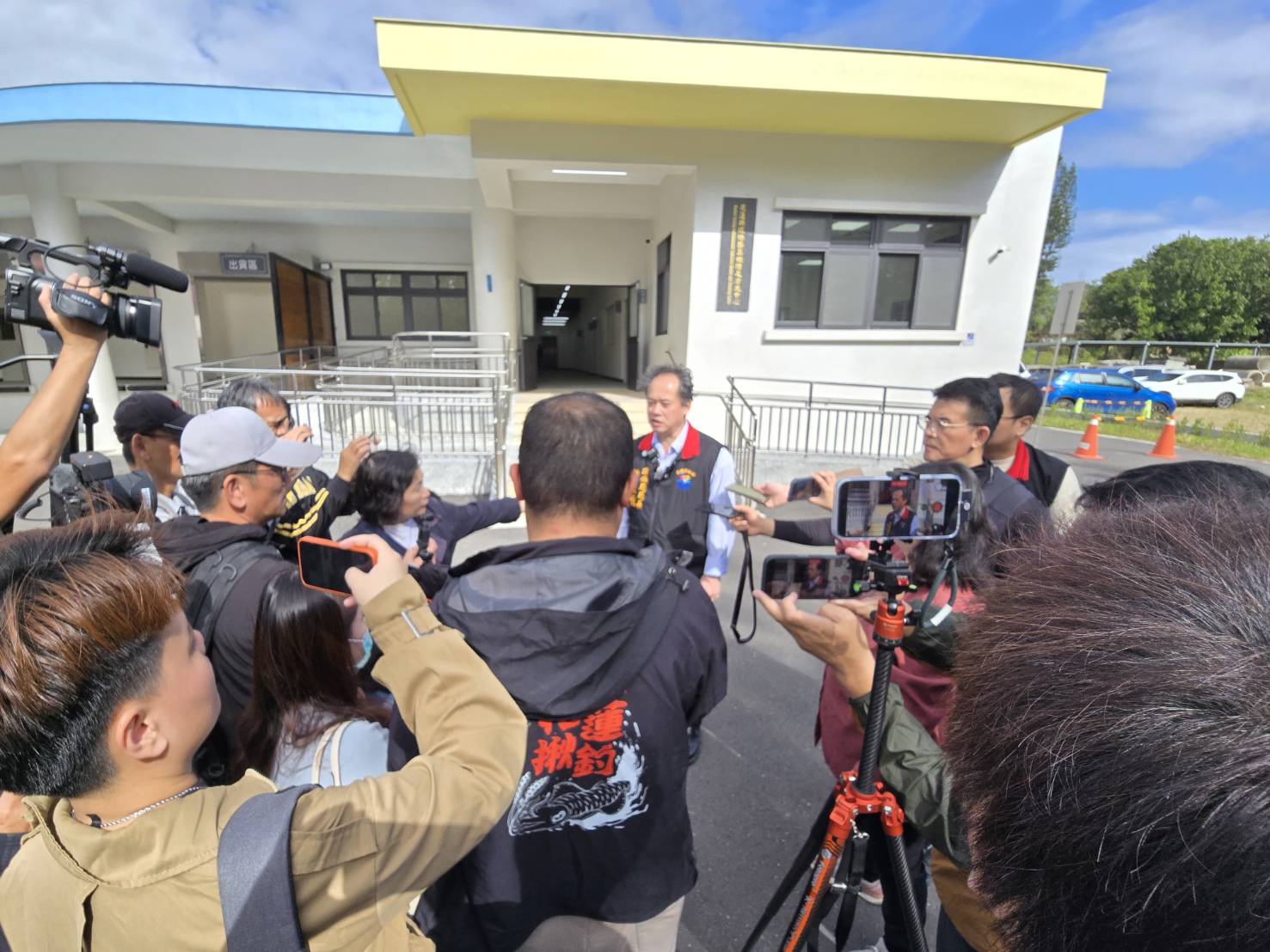 ▲大批記者圍繞環保局長饒慶龍探問環保餐具清洗中心功能性。