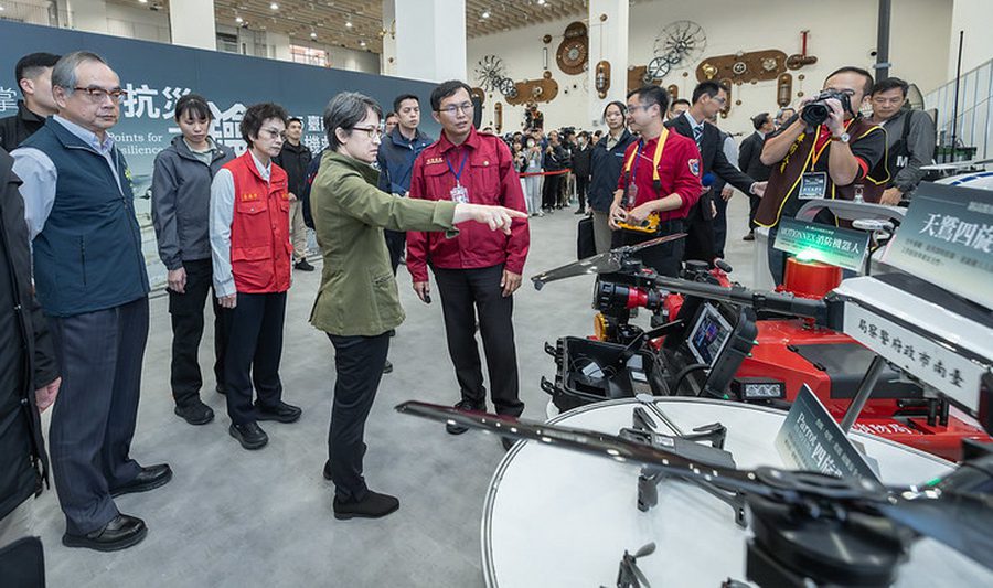 蕭美琴在臺南市長黃偉哲的陪同下,參觀無人機展示區,以及其他防災應用設備。她指出,近年來,臺灣除了面對地震外,也頻繁發生風災,帶來更多、更複雜的複合式挑戰,希望未來能導入科技做更周全的準備,讓災害風險降至最低。