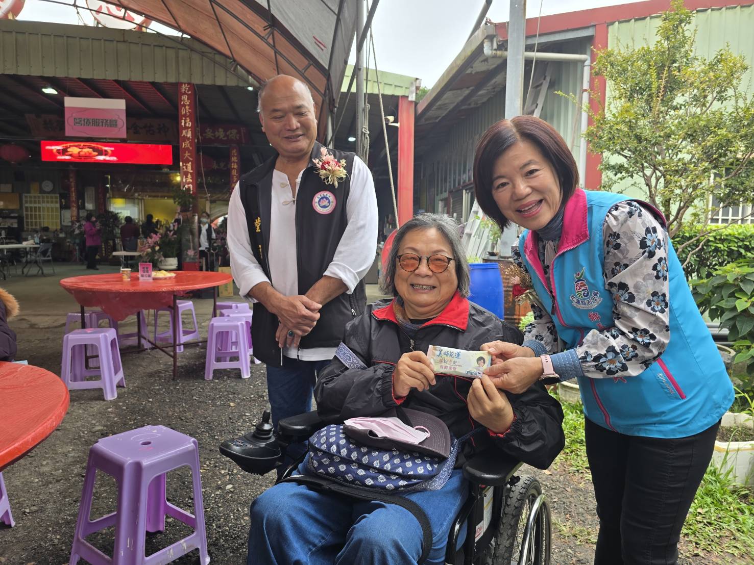 ▲吉安鄉長游淑貞(右)致贈花蓮縣脊髓損傷福利協進會理事長彭儀珠(中)濕紙巾,慈靈慈惠堂主彭進益(左)微笑直點頭 。