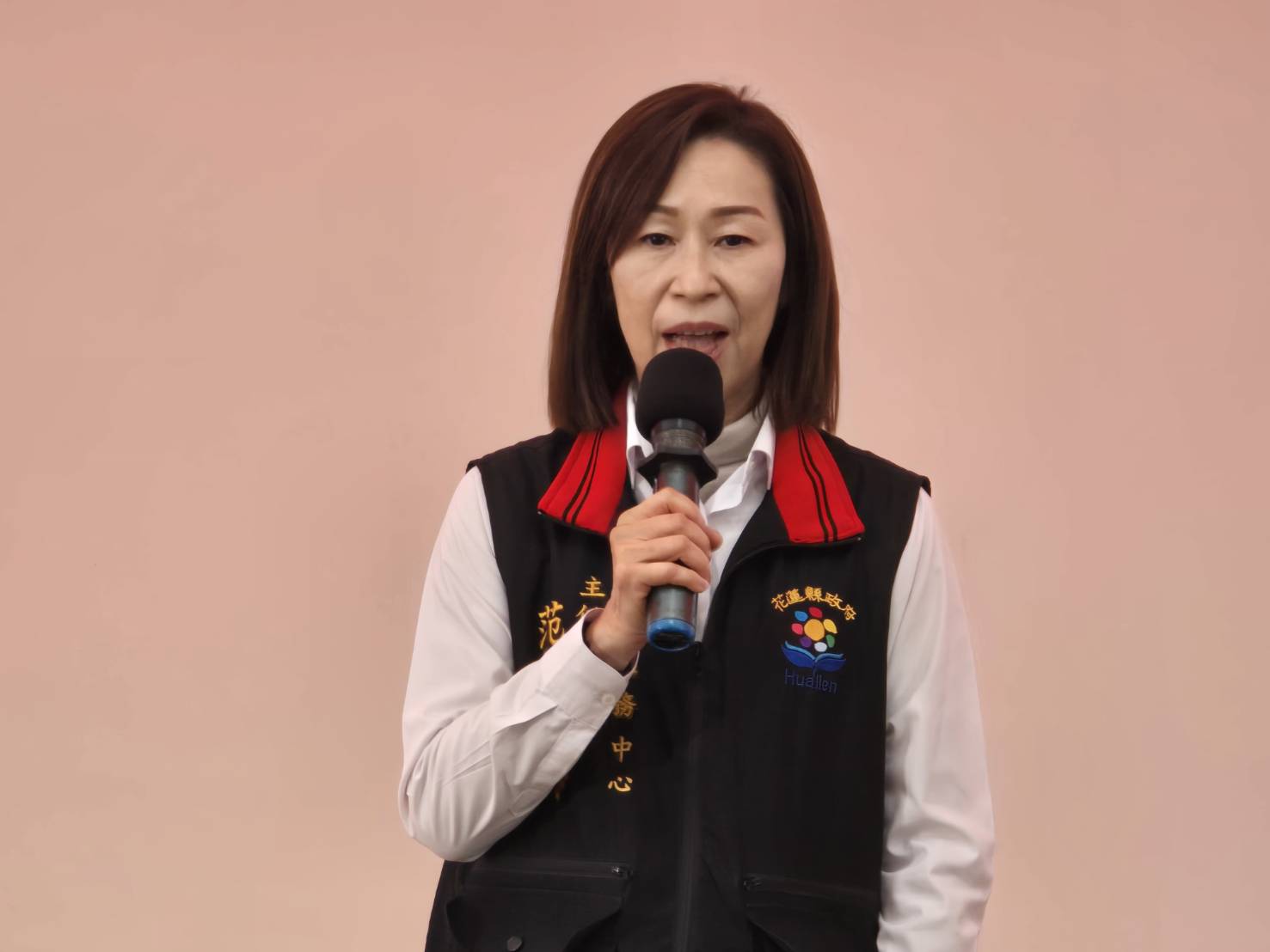 ▲花蓮縣政府北區服務中心主任范姜羞玲祝福大家「馬上快樂」。
