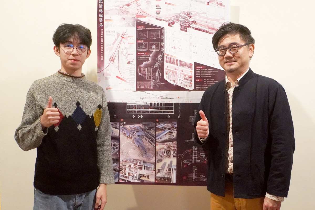 ▲大葉大學空設系紀彥竹老師(右)指導大四生黃朝瑞(左)獲全國學生競圖特優。(圖/大葉提供)