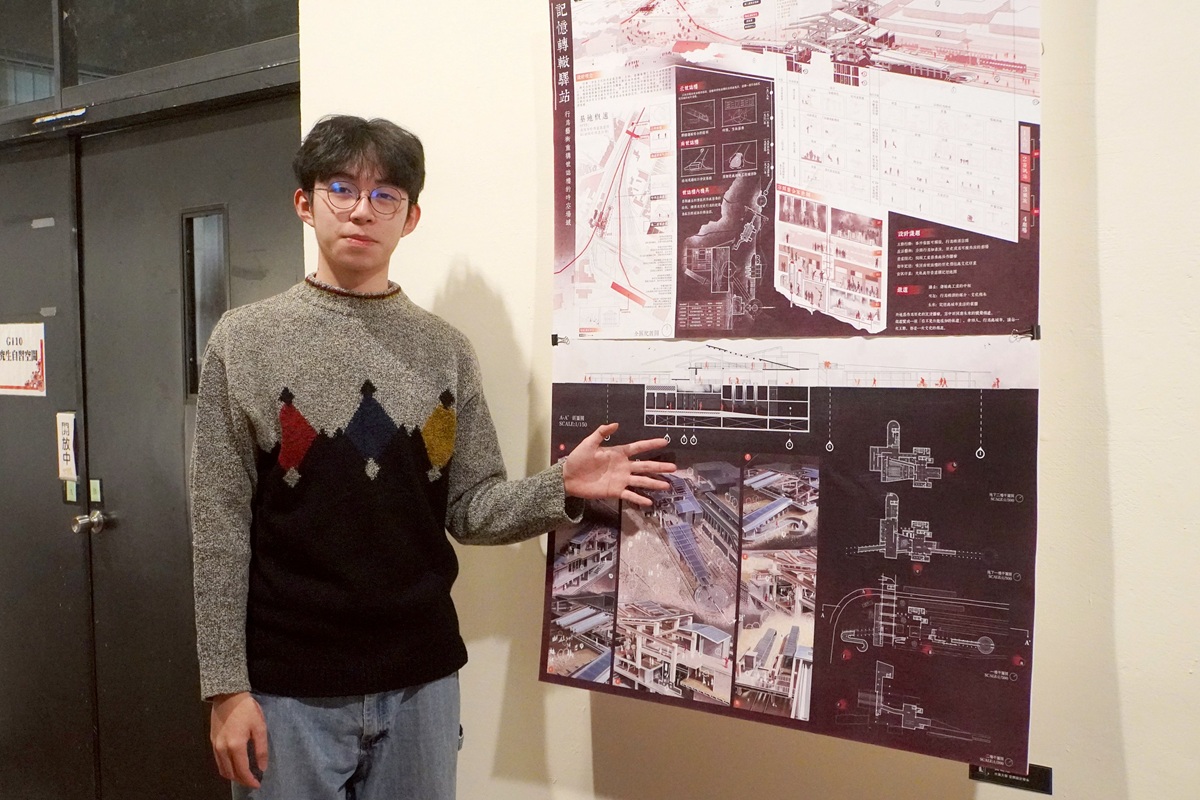 特優作品「記憶流轉之驛-人與城市的行為軌跡劇場」,由紀彥竹老師指導,黃朝瑞設計,以高雄哈瑪星鐵道園區為基地,重構號誌樓空間,轉譯鐵道歷史與城市記憶。黃朝瑞同學指出,他本身是鐵道迷,因此選擇曾經造訪過的哈瑪星鐵道為基地,透過光、聲、行為裝置與空間互動,引導使用者以身體感官行走於歷史之中,重新感受城市緩慢而溫柔的呼吸。準備競圖期間時間壓力相當大,必須在三個月發展內概念並整合設計,與紀彥竹老師密集討論後,逐步釐清作品核心,很開心能順利完成並獲得評審肯定。