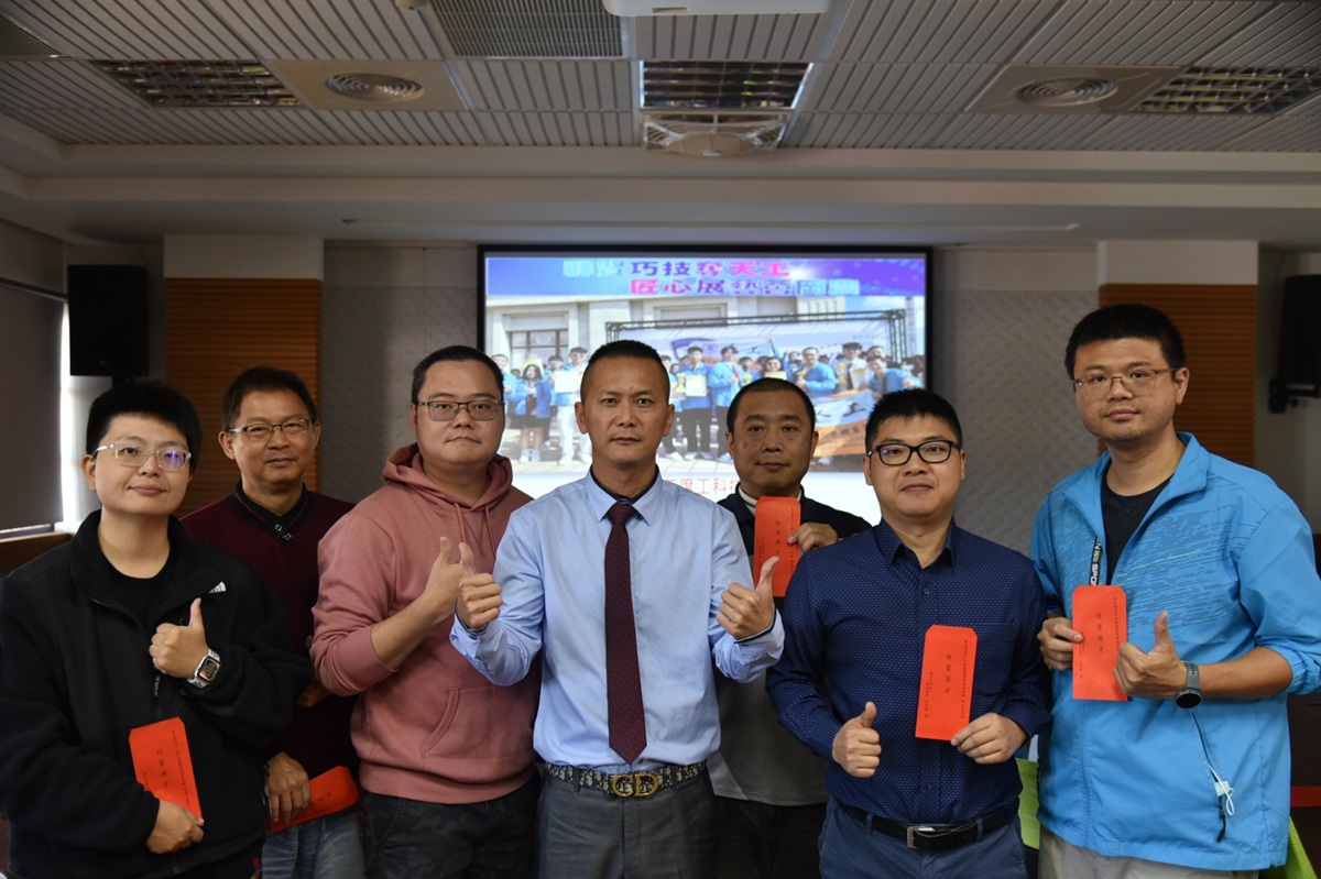 校友會理事長,彰晟營造曹榮源董事長以及家長會江威漢會長,特地頒發獎勵金給工業類技藝競賽得獎選手,曹理事長表示,學弟妹傳承校訓「勤樸專精」的精神,一步一腳印耕耘技藝,值得肯定,未來校友會也會持續支持技藝競賽所需。家長會江威漢會長也感謝指導老師傾囊相授,讓選手專業能力更上層樓。家長會也會持續獎勵選手及指導老師。