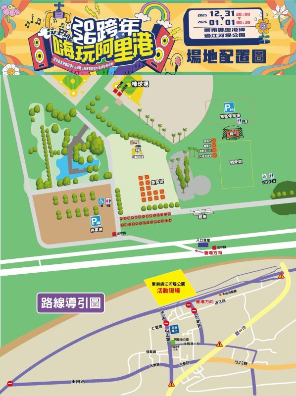 三地門鄉公所於12月31日18時至 115年1月1日0時,假三地門鄉公所廣場前,舉辦「三地門鄉迎接2026跨年晚會,該活動演出均在三地門鄉公所廣場內,於12月31日17時起至115年1月1日1時止,實施交通疏導。