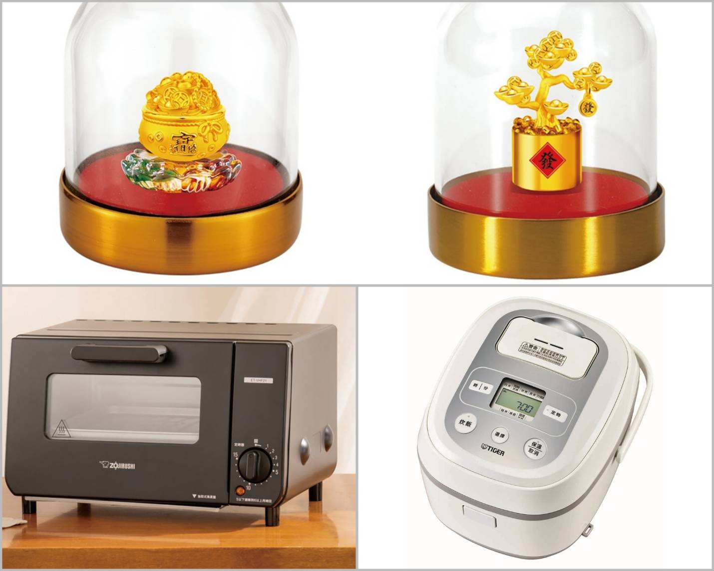 ▲虎牌推出日本製微電腦炊飯電子鍋,買10送1;象印電烤箱,買6送1;真愛密碼則主打招財納福系列擺件,包括聚寶盆與發財樹款式,金價依當日行情計算。( 圖 業者提供 )