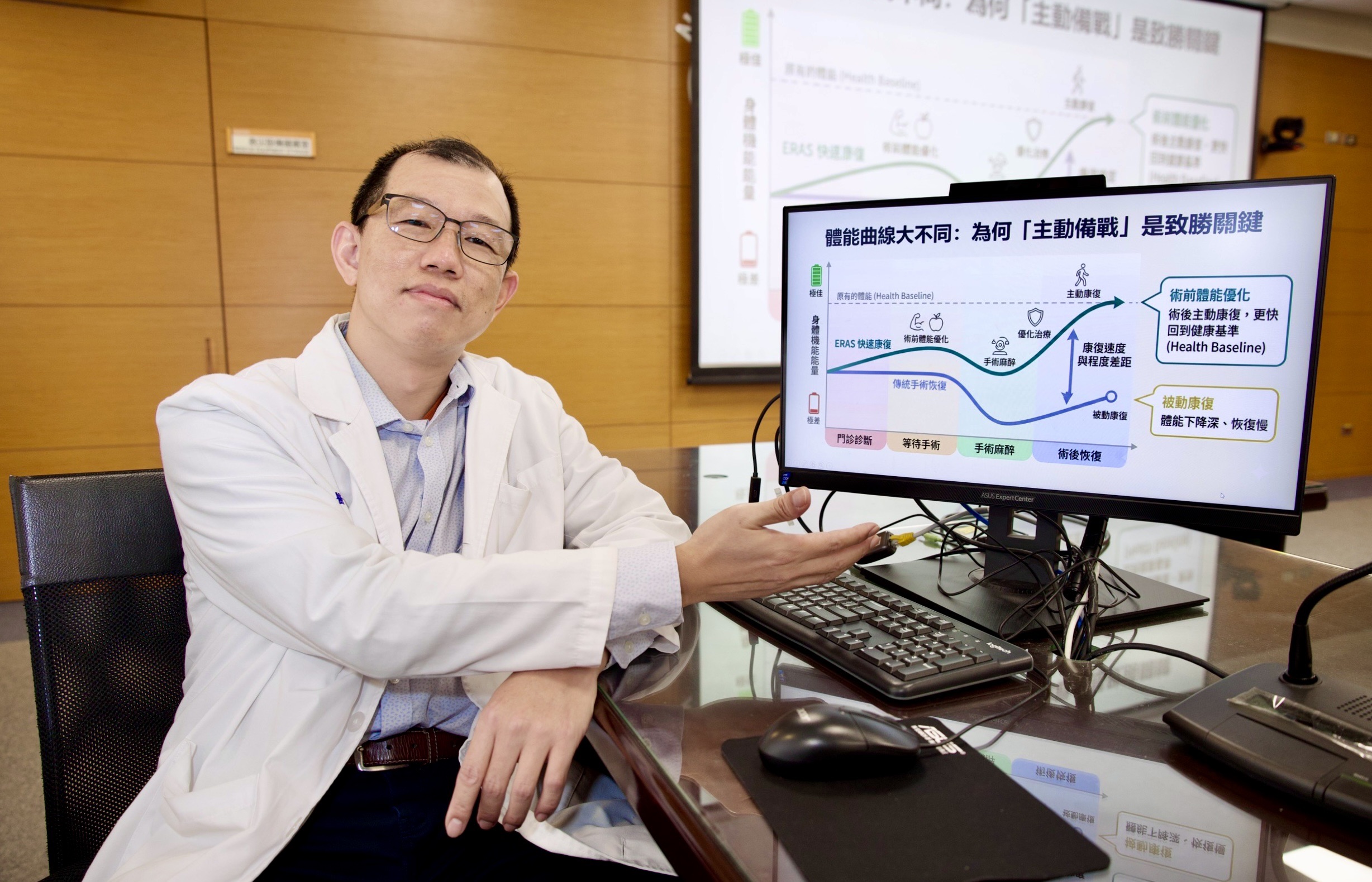 手術不只是上手術台的那一天,而是一段需要「準備」的健康挑戰,成大醫院直腸肛門外科陳柏全醫師常向病人說,「手術中辛苦的是醫師,但手術前後的調整、配合與恢復,需要病人共同投入及努力。」這正是「術後加速恢復(Enhanced Recovery After Surgery, ERAS)」的核心精神——醫療團隊與病人攜手,使手術恢復不是被動等待,而是一場有計畫、有目標的旅程,成大醫院由外科部、麻醉部、護理部、營養部與復健部等多專業團隊共同推動ERAS流程。陳柏全醫師分享,團隊近期照護92歲的白先生,有高血壓與糖尿病,因血便及便祕就醫後確診左側降結腸癌,雖然癌症尚未轉移,但考量年齡及共病風險,團隊立即啟動ERAS照護流程,特別強調術前「備戰」的重要性,在手術前4週,個案管理師完成體能與生活品質初評,復健醫師與復健師提供居家肌力訓練計畫,使白先生的體能明顯提升,也讓手術風險大幅降低。