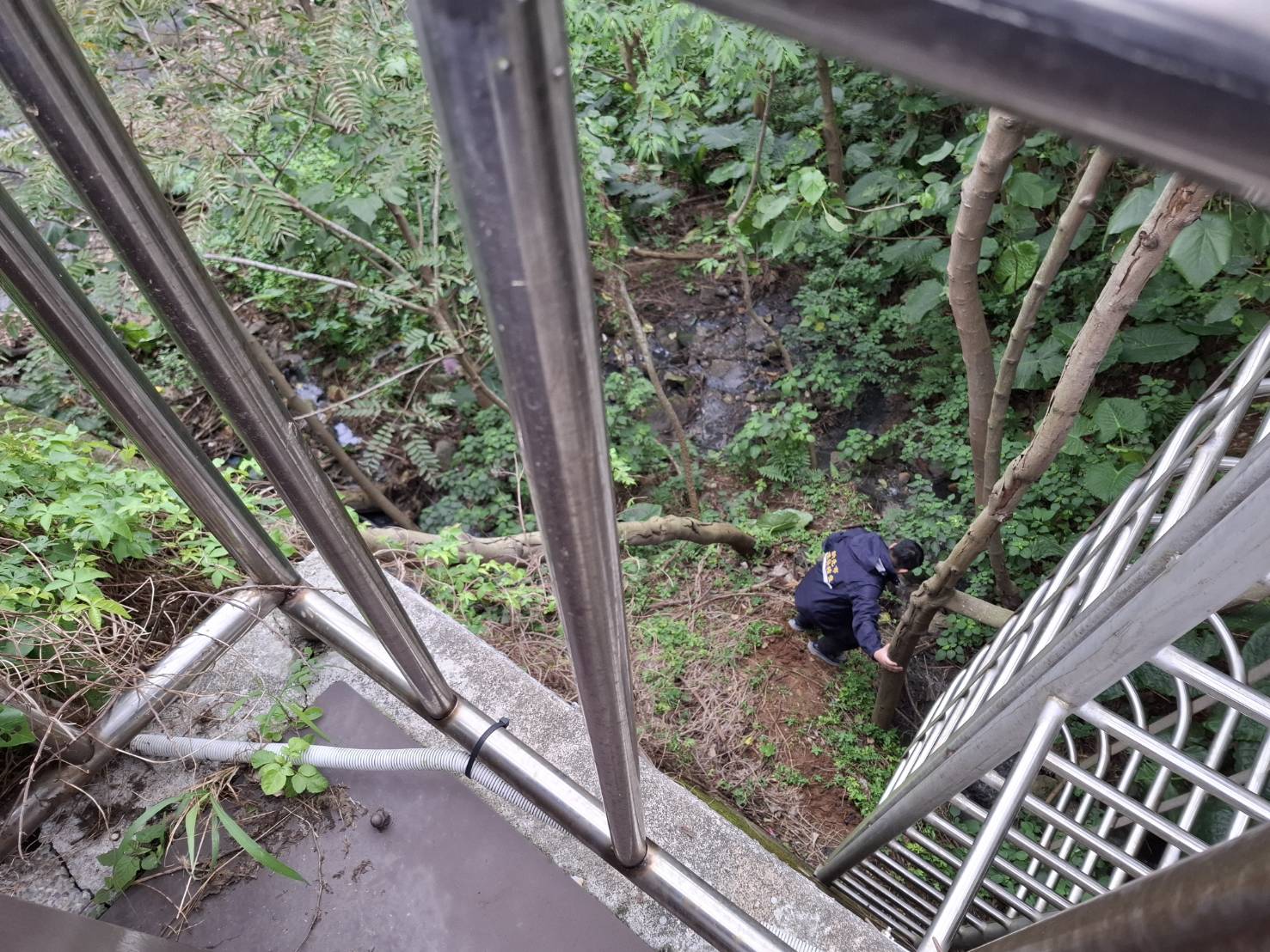 ▲稽查人員為找出破壞環境元兇,前往地勢高聳、草木叢生之區域找尋可疑污染源。(圖/新北市環保局 提供)