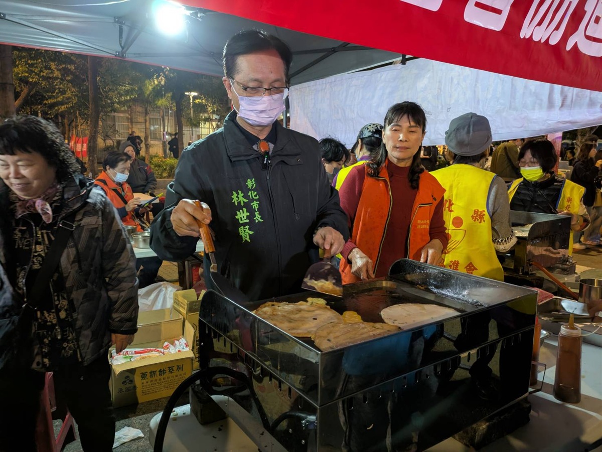 ▲活動現埸市長林世賢親手煎蔥油餅義賣,增添活動溫馨暖舉。(圖/彰化市公所提供)