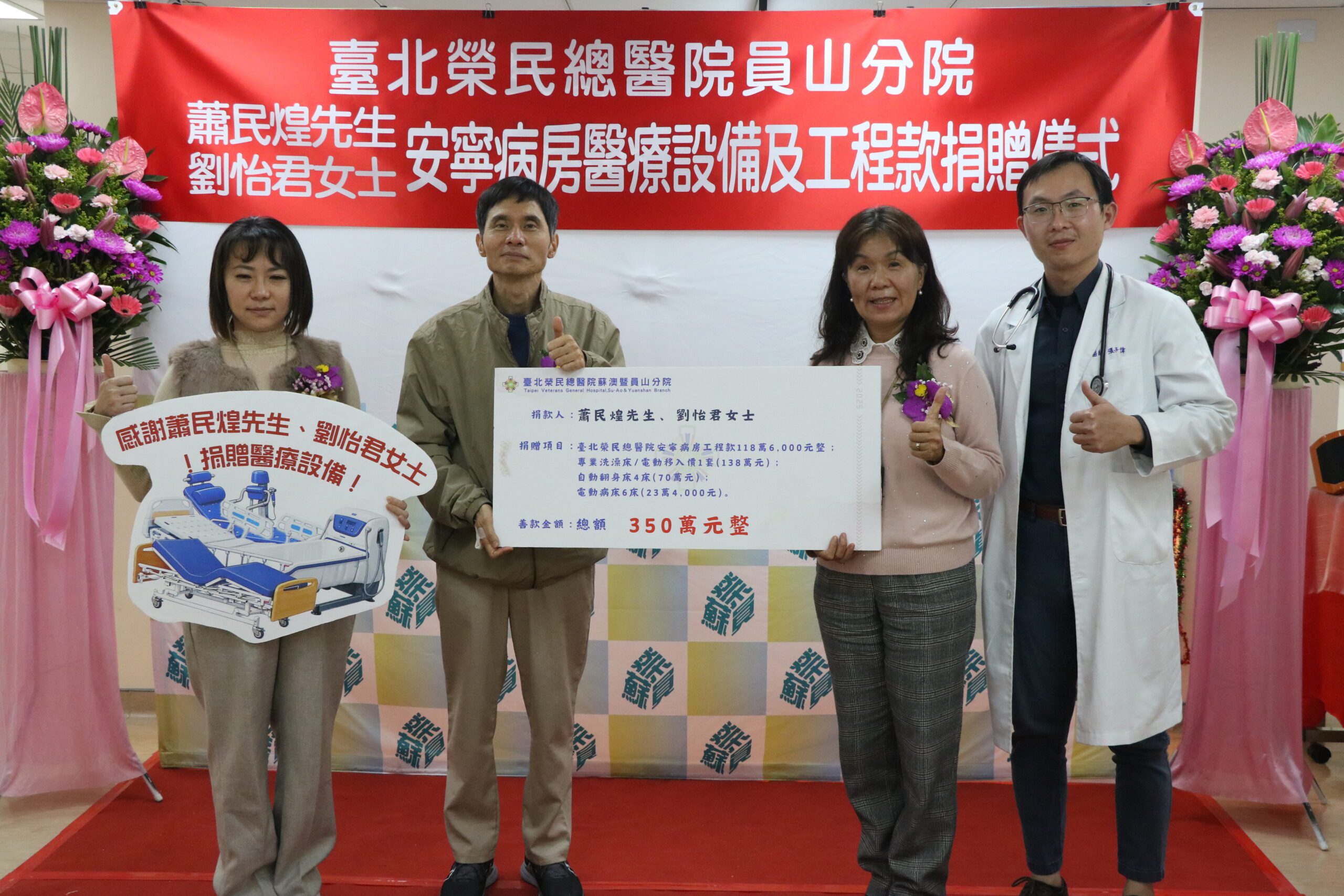 安寧病房張子偉主任指出,蕭先生、劉女士除捐贈專業洗澡床及電動移入架各1套、自動翻身床4床、電動病床6床外,並另捐助工程款新臺幣118萬6,000元,以讓員山分院的設備可以比擬台中榮總,全面強化安寧病房硬體設備與照護機能,大幅提升病房照護品質,減輕醫護人員照護負擔,讓病人得以在更安心、舒適且有尊嚴的環境中,接受完善的安寧照顧。