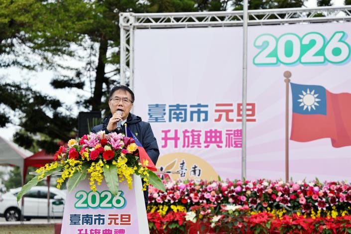 【記者郭忠淵/台南報導】 台南市政府(1)日舉辦115年元旦升旗典禮,市長黃偉哲率領市府團隊,一早先到新營區,再到安平區,與市民朋友一同在莊嚴隆重的升旗儀式中迎接新的一年。黃偉哲祝福市民朋友在115年馬年能夠龍馬精神、一馬當先,家庭和樂、身體健康,城市與國家持續向上發展。