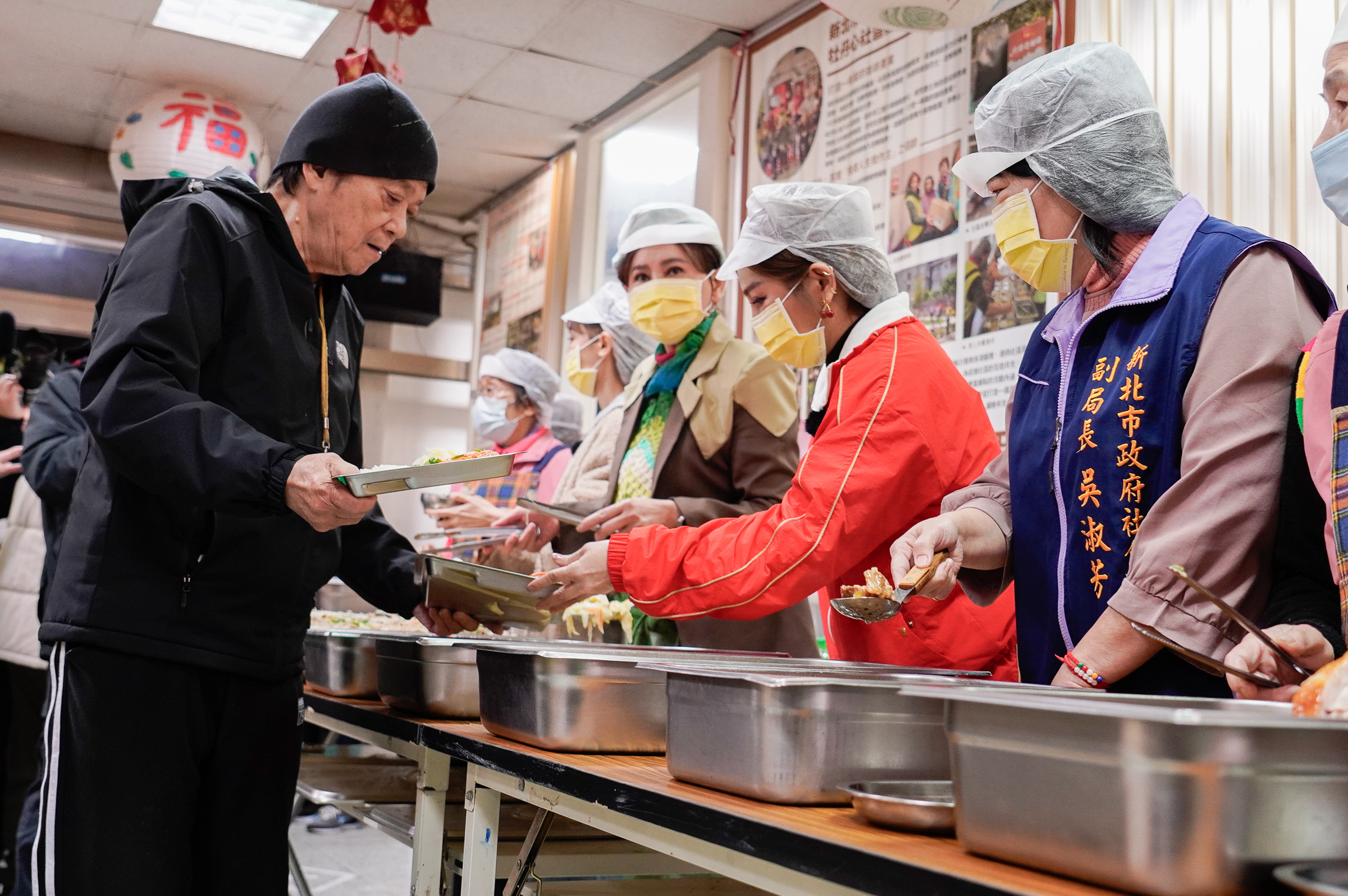 ▲社會局副局長吳淑芳(右起)和王彩樺、陳亞蘭一起幫忙長輩打菜。(圖/新北市社會局 提供)