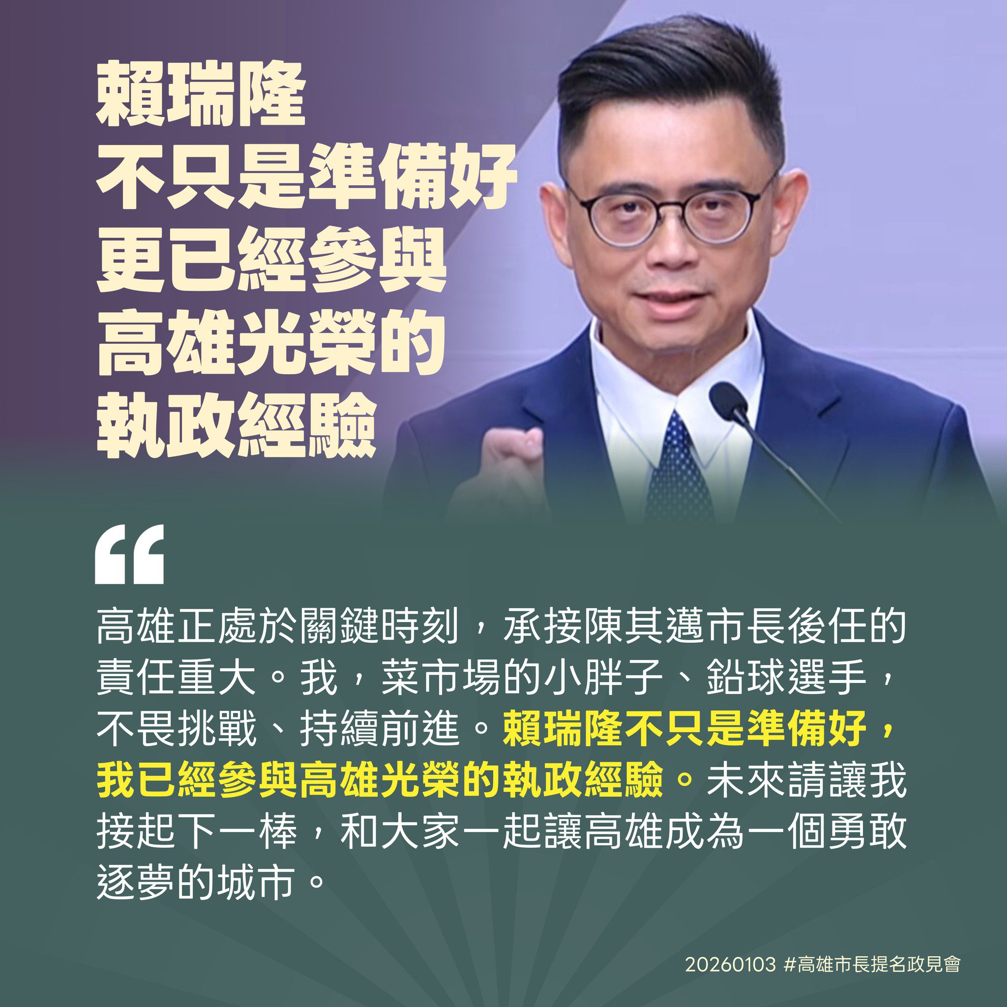 最後賴瑞隆表示,高雄正處於關鍵時刻,承接陳其邁市長後任的責任重大。他以自身「菜市場的小胖子、鉛球選手」的成長經驗自許,強調不畏挑戰、持續前進的精神,正是面對城市治理最需要的態度。他重申,自己不只是「準備好」,更早已參與高雄光榮的執政經驗,盼與市民並肩讓高雄成為一座勇敢逐夢、穩健前行的城市。
