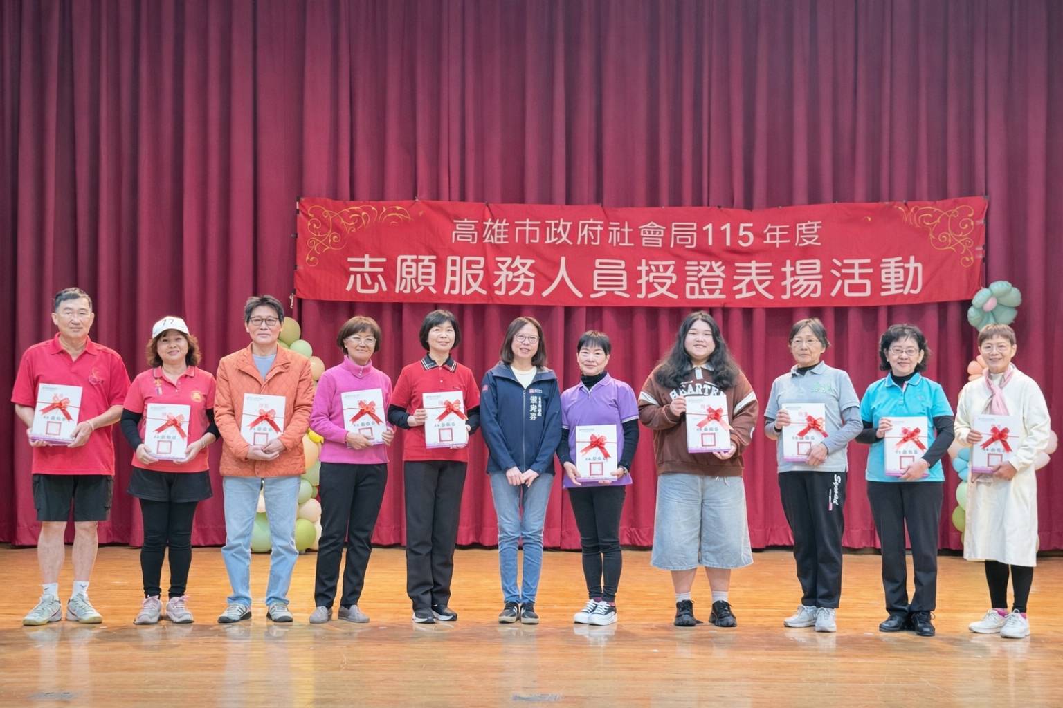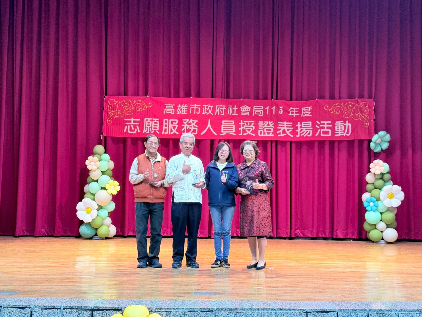 志工鄧秀英榮獲「志工特殊貢獻獎」及全國第30屆金駝獎;林吉興以「一日志工,終身志工」為信念,榮獲全國志工終身奉獻獎;蔡文發與蔡李素英夫妻攜手服務25年,橫跨社福、教育、醫療與司法領域,榮獲全國志願服務模範家庭獎。此外,李滿龍、陳惠理、岑歡琼、許逸嫻與熊燕等志工,也分別獲頒金暉獎、好人好事代表及全國績優志工金牌獎,充分展現高雄志工多元而厚實的服務能量。
