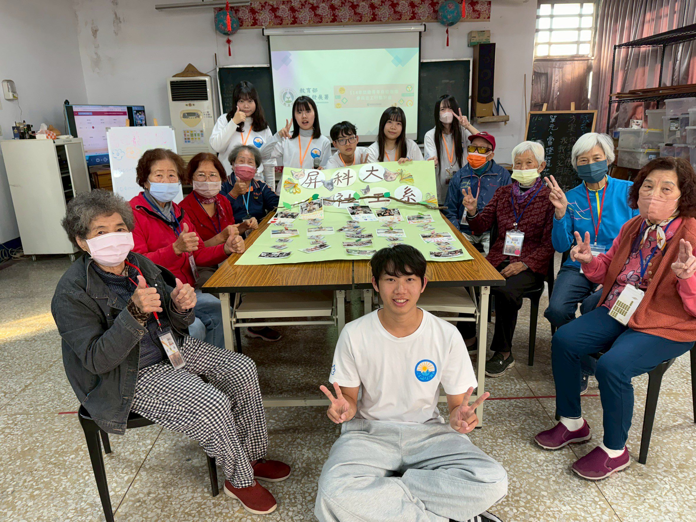 在最後一次活動裡和長輩一起共同完成卡片以及海報,海報上貼滿了這八次活動裡滿滿的回憶,卡片中也表達了這八次活動的心情。屏科大社工系學生傅達仁表示「這次藉由青發署自組提案計畫的機會學習到了如何設計課程、如何準備活動材料以及與長輩互動的技巧,這些都是難能可貴的經驗,在此活動學到的不只有做志工這麼簡單,也很感謝社區的督導,從一開始的社區參訪到最後一次的活動都默默幫助我們,在我們活動面臨問題時適時地提點給予我們建議及想法」。和興社區社工督導黃崇能表示「能看到大一的學生對於社區的志工服務這麼有熱誠實在是很難得,學生們對如何規畫舉辦活動也越來越上手,也希望能把社區學到的知識帶回校園加以利用」。