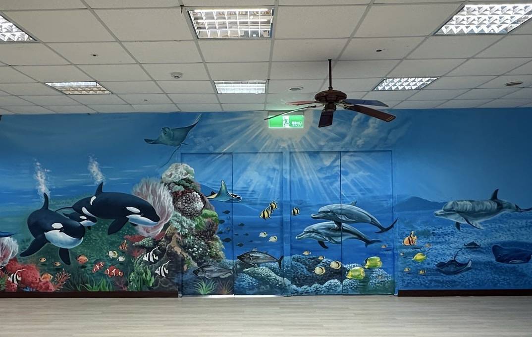 ▲李再添老師為多功能休閒室進行海洋世界主題彩繪,相當吸睛。