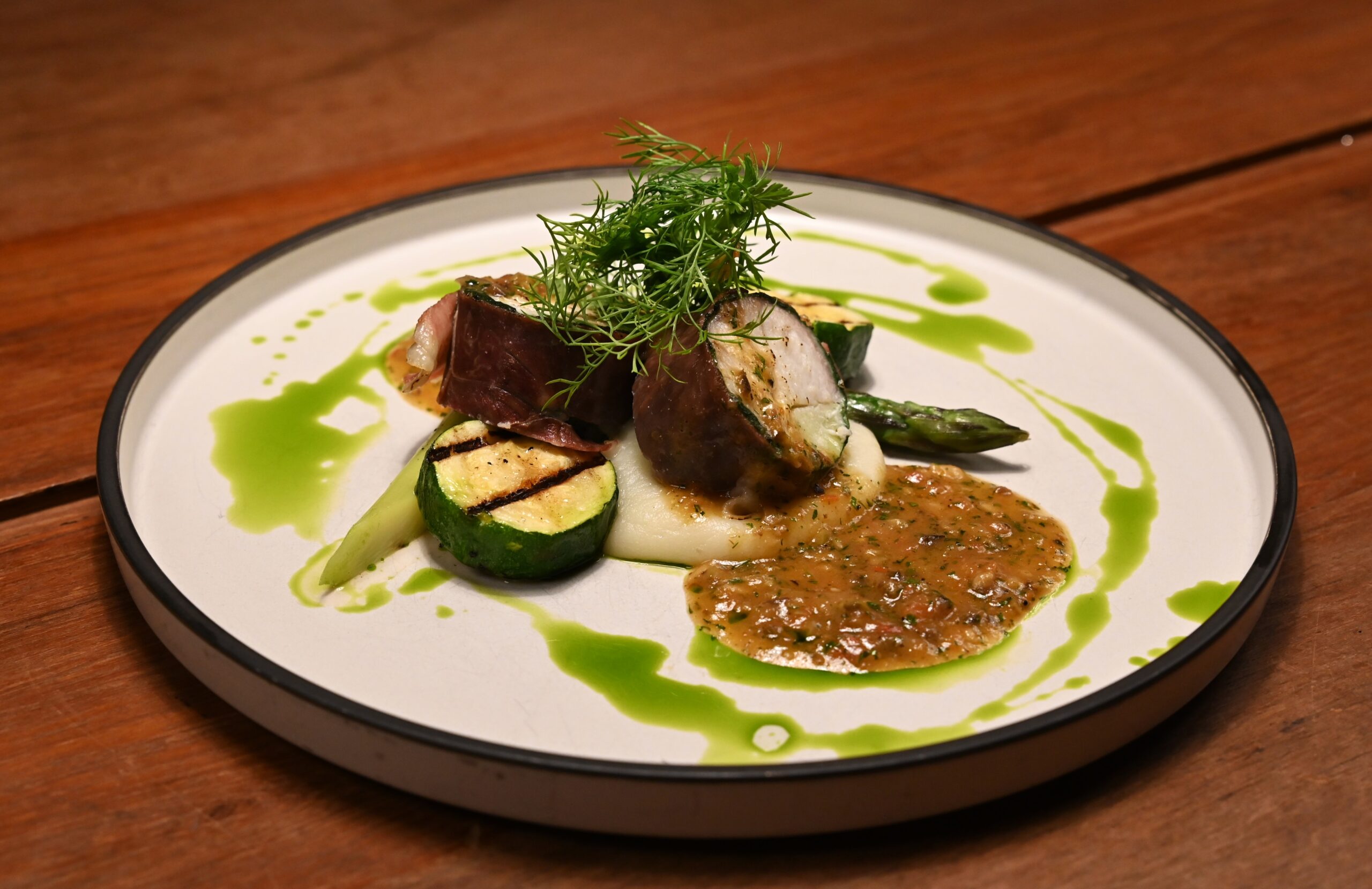 沉浸在托斯卡尼的春天是許多人對義大利的絕美印象。以海鮮包裹田園的概念當屬特別菜式,並無在本季菜單上。取材自義大利聖誕節只食海鮮的傳統,極為經典的歐洲料理。以生火腿包覆澎湖冬季盛產的海鱺魚,內餡加入干貝慕斯,切面呈現雙層口感,搭配地中海風格奶油醬汁,古典優雅。