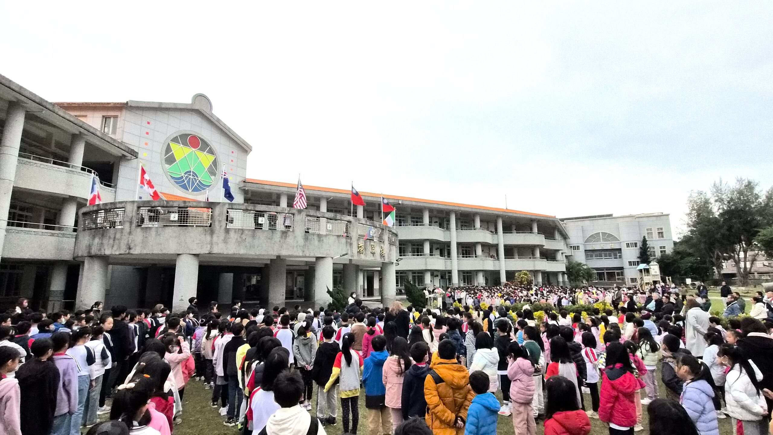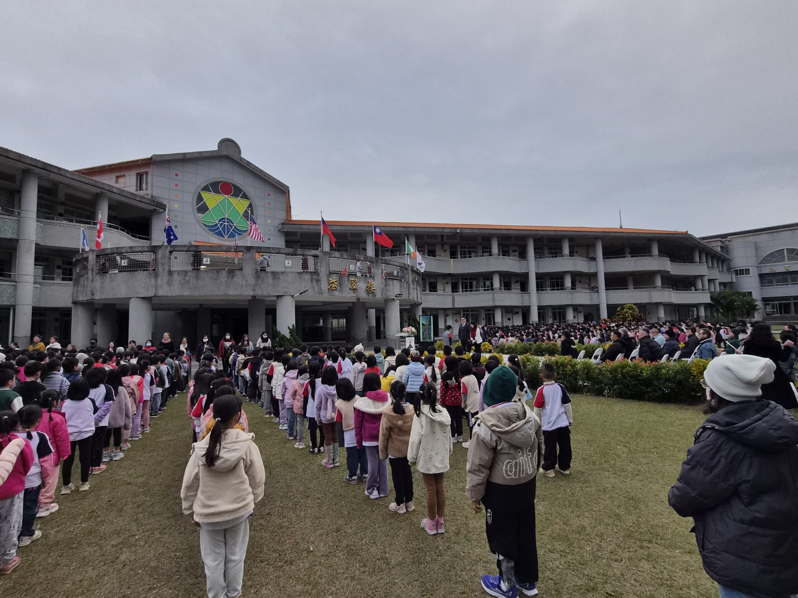 學生自治市長陳冠穎以流暢的中英文向全體師生與來賓問安,邀請大家抬頭看看同時升起的多國國旗。他表示,校園中有來自美國、加拿大、日本、越南、印尼、菲律賓等不同國家的同學與朋友,雖然大家的膚色、語言與文化背景不同,但都在快樂地在同一個教室學習、同一個操場奔跑。