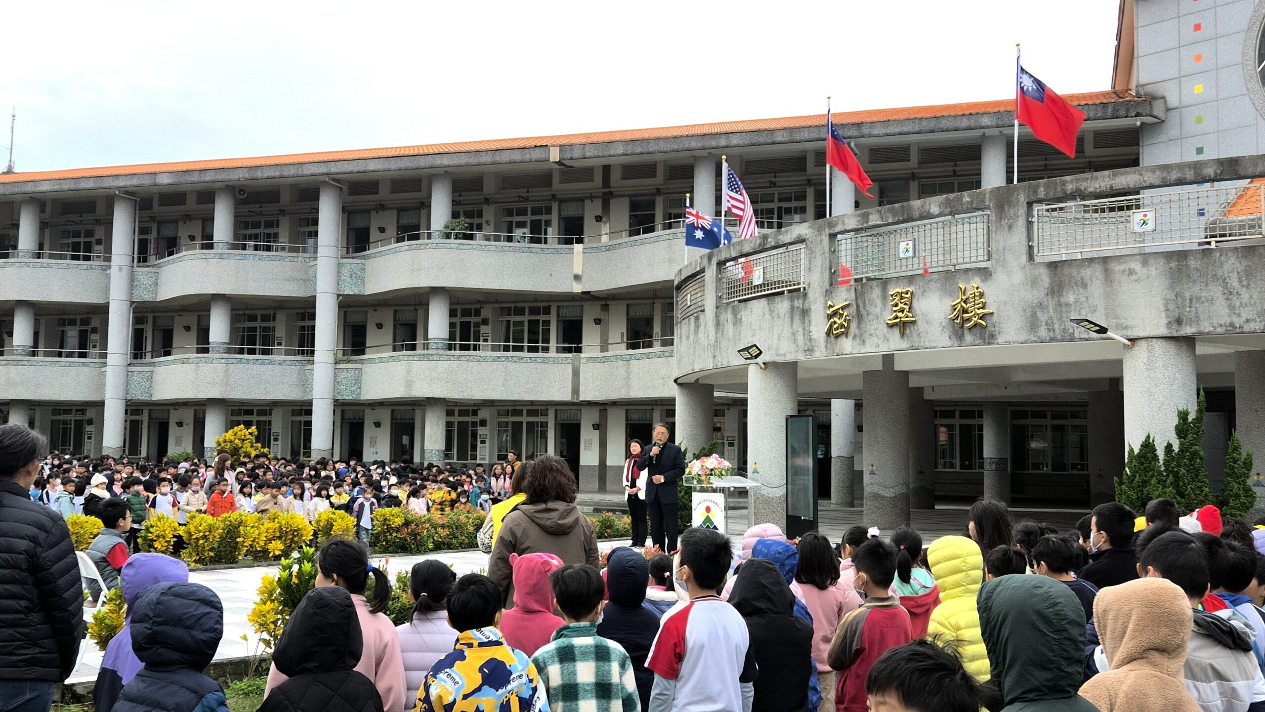 今天上午8時聯合升旗典禮中,校長張慧娟致詞表示,這不僅是一場儀式,更是學校長期推動國際教育的重要象徵。東華附小透過文化走讀、姊妹校交流、泰迪熊旅行、文化盒分享與筆友書信往來等系統化課程,讓孩子在真實情境中認識世界、理解差異,並培養尊重多元的國際素養。她也特別感謝來自不同國家的家長走進校園,透過故事、影片與文化分享,讓孩子們以五感體驗世界。
