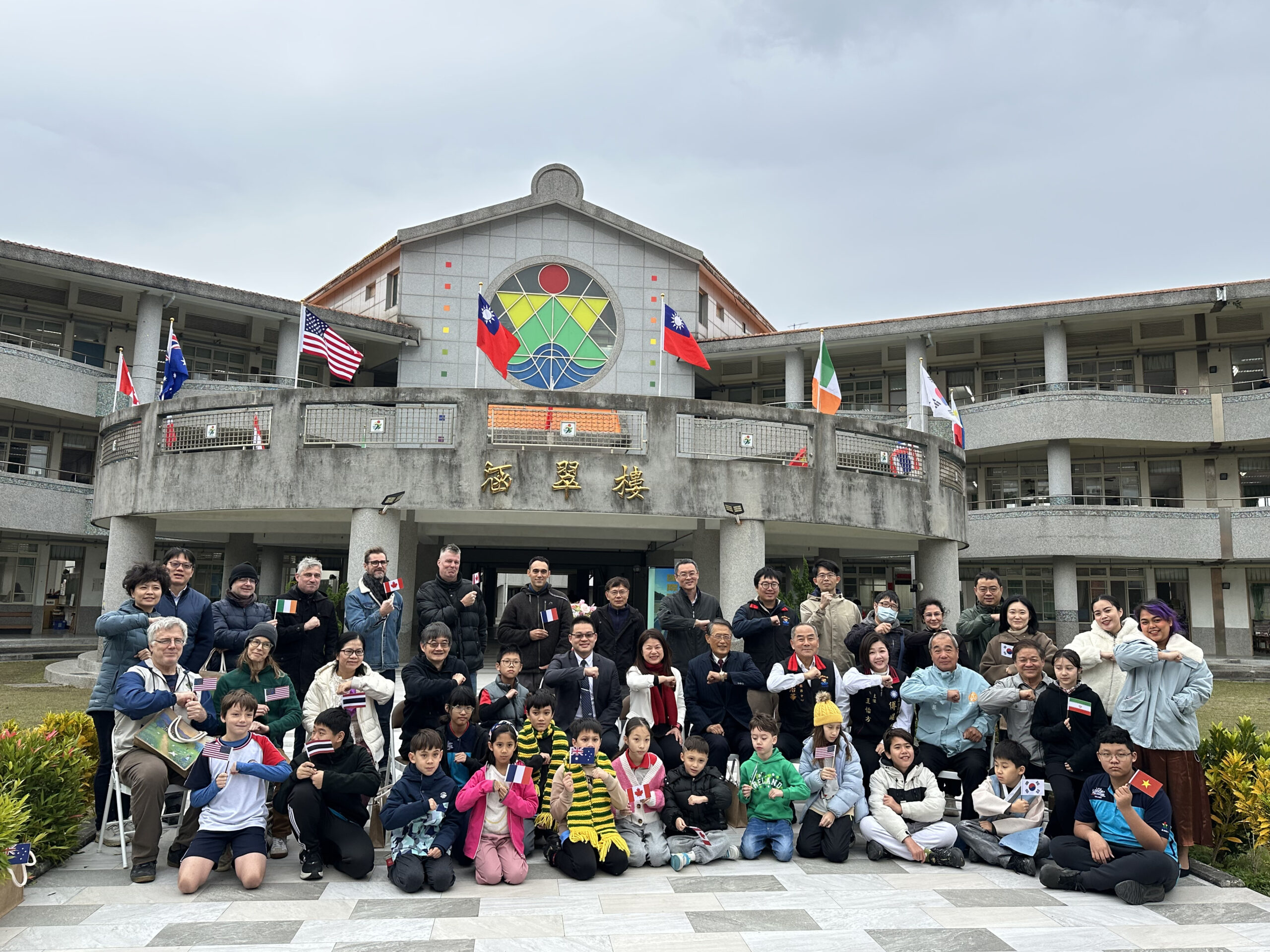 ▲東華附小校長張慧娟(中排中)與來自12個國家的家長及學生合影。