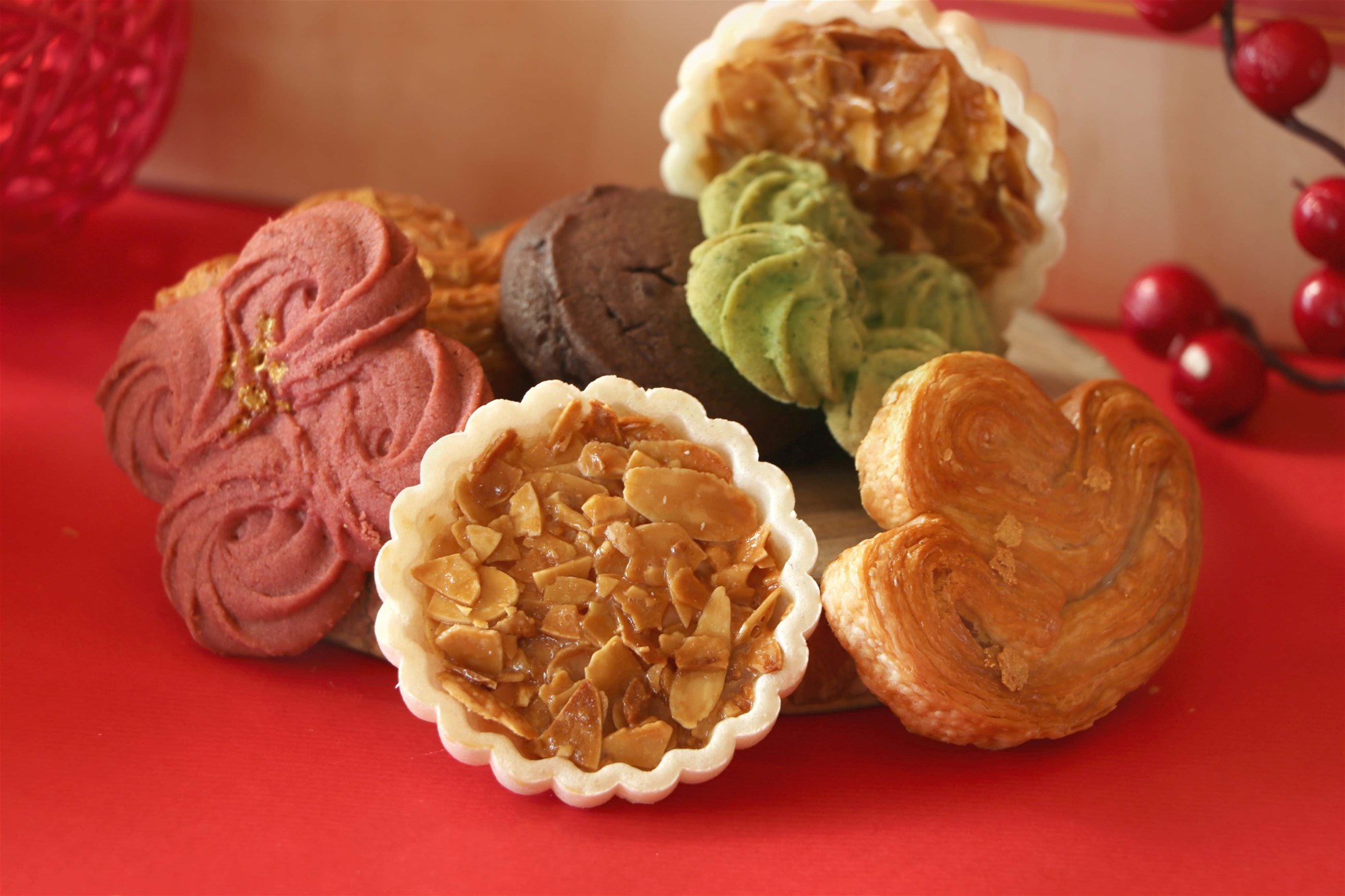 ▲五款層次鮮明的風味,從鹹甜交織的「菠菜海苔乳香酥」、色彩喜氣的「緋紅絲絨乳香酥」到醇厚回甘的「經典黑巧美式餅」,每一口都是大地酒店對馬年「豐收富足」的美好祝願(圖/大地酒店提供)