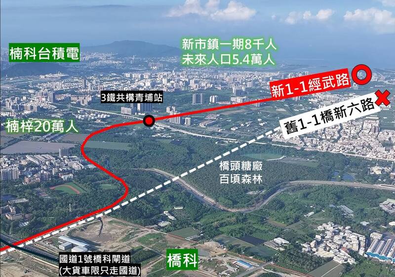 根據環團提出的「新1-1」道路路線,從經武路-清豐六路-芎林路-橋科,莊傑任說明,該道路有多項好處,首先,舊1-1道路距離三鐵共構青埔站800公尺遠,新1-1經武路則直接與青埔站重疊、零距離,是最佳的主幹道路線;其次,新市鎮一期目前居住近8000人,一期的計畫人口達5.4萬,從新市鎮一期中心點的經武路出發到橋科,走新1-1道路,可以比舊1-1縮短200公尺以上距離,約半分鐘到1分鐘車程。